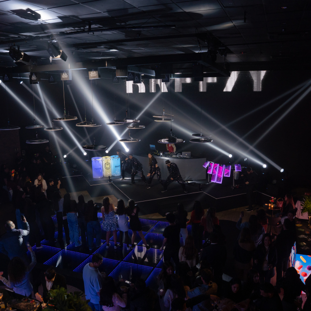 Testeira de LED 4×1, 2 bicos de CO² (25kg cada), palco 6×4 com forração carpete preto, house DJ e 4 movings. 4 bailarinos.