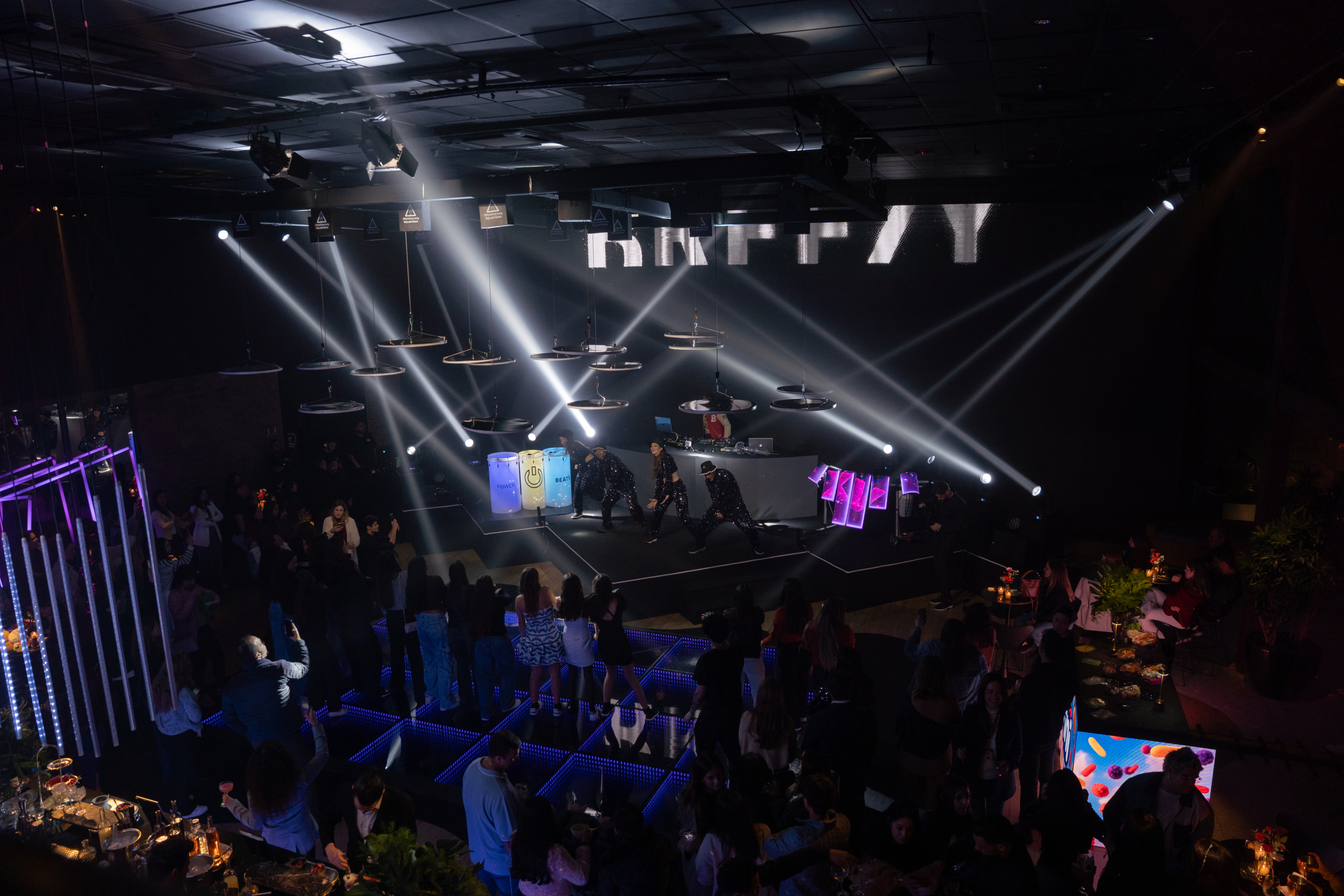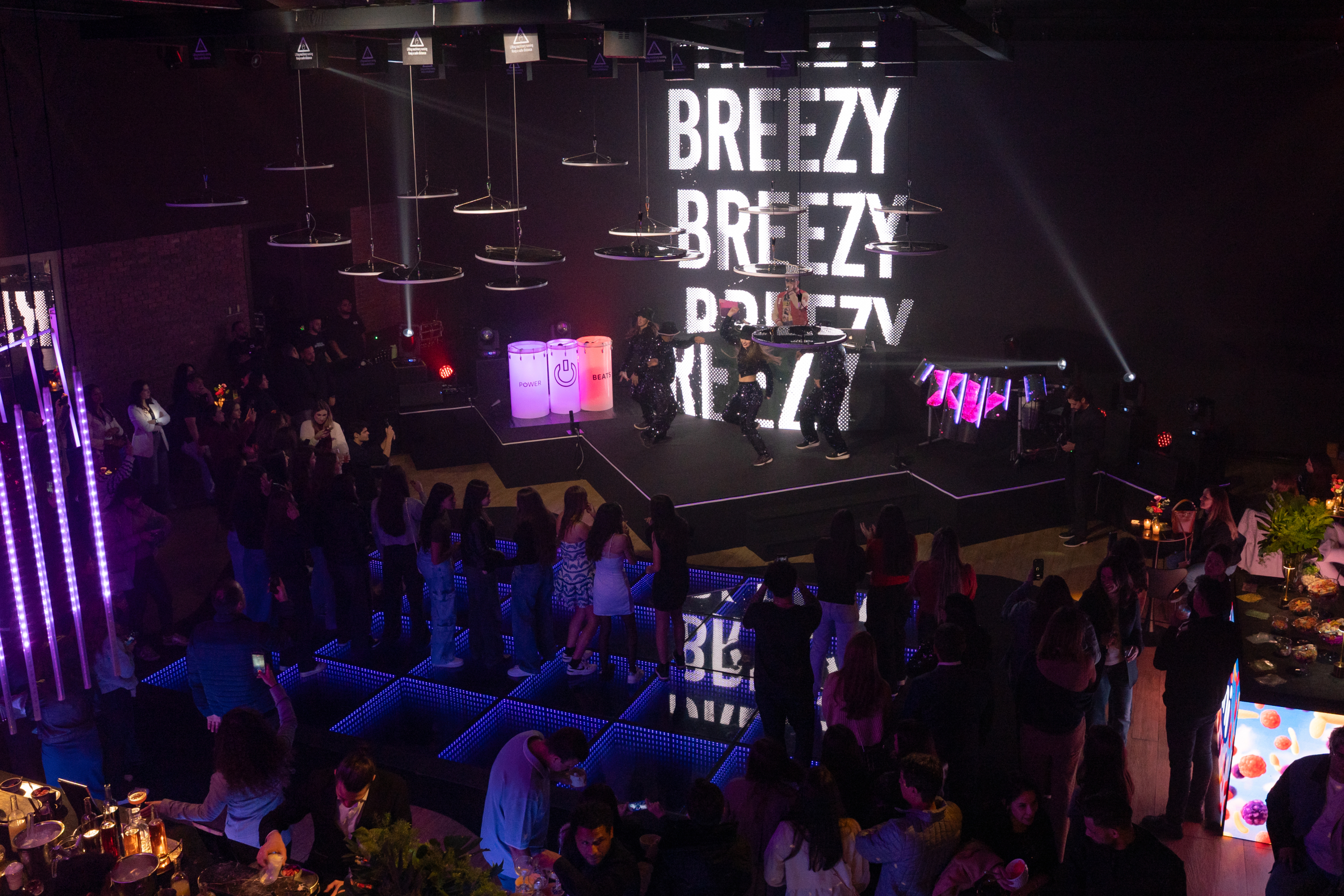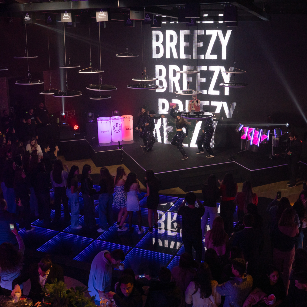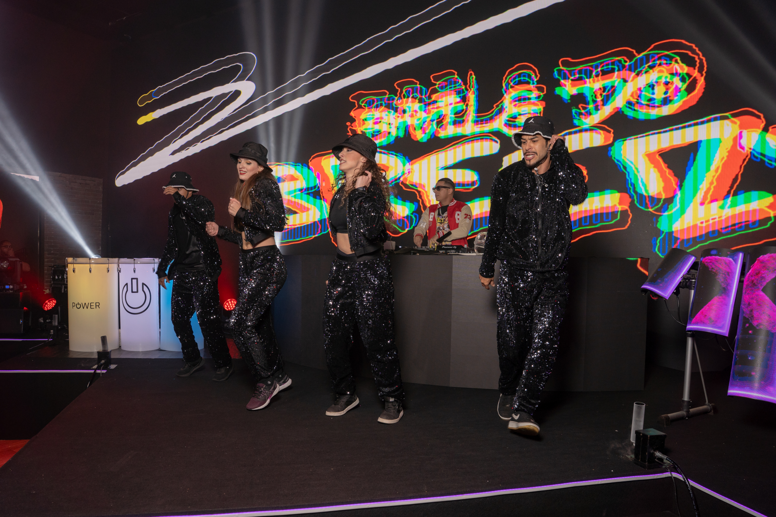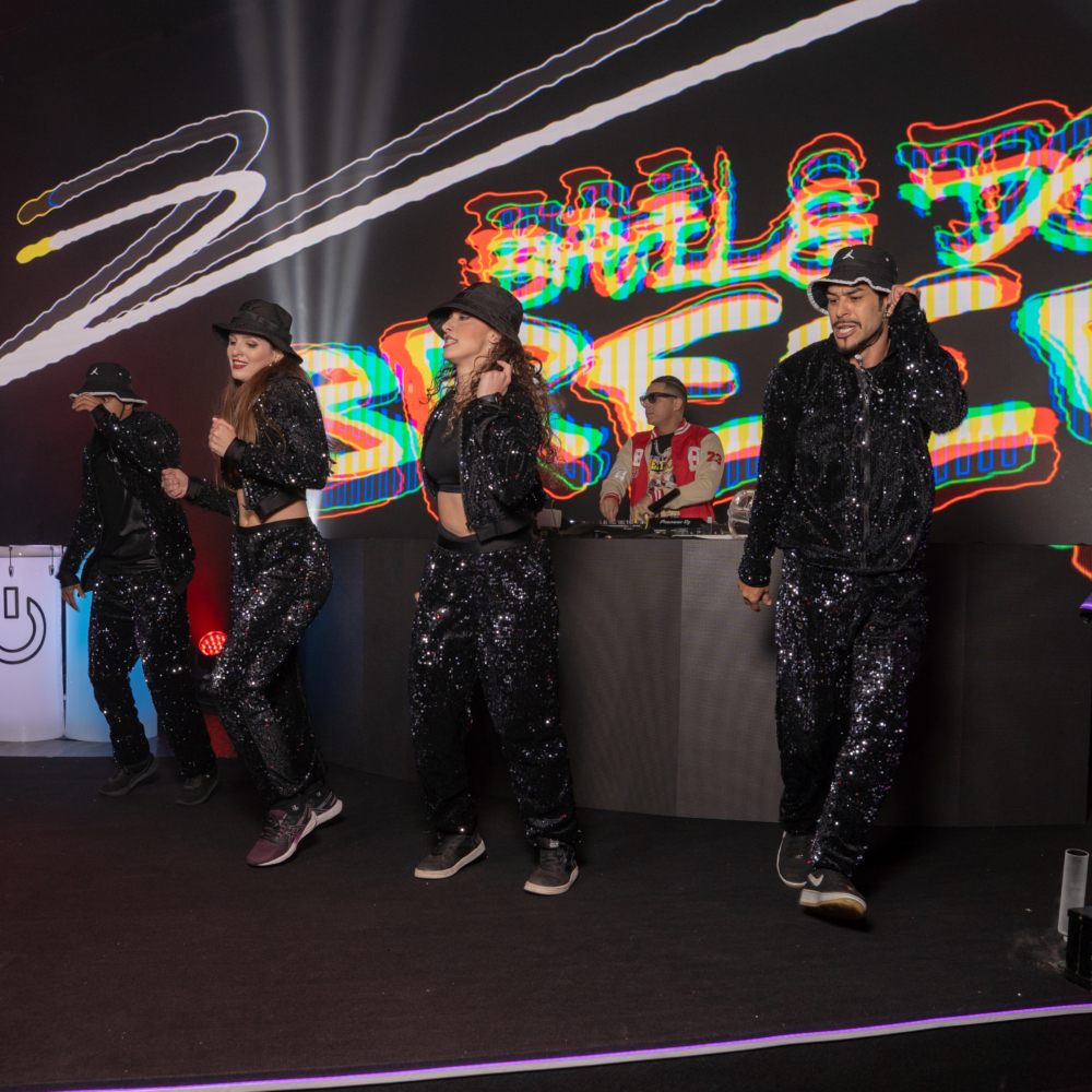 Testeira de LED 4×1, 2 bicos de CO² (25kg cada), palco 6×4 com forração carpete preto, house DJ e 4 movings. 4 bailarinos.