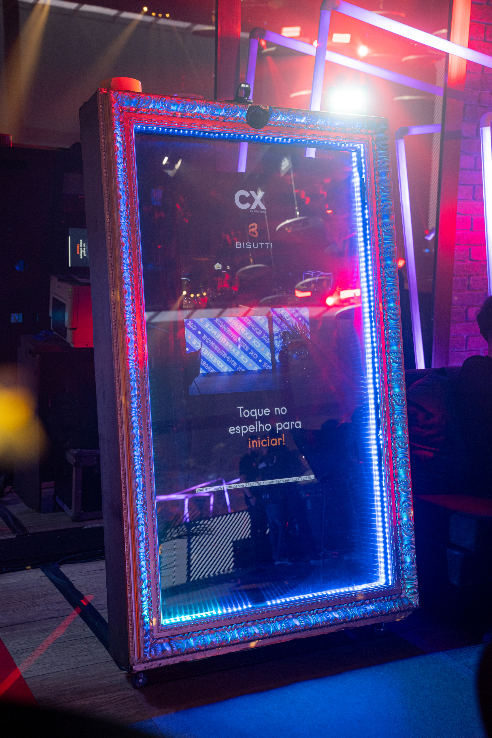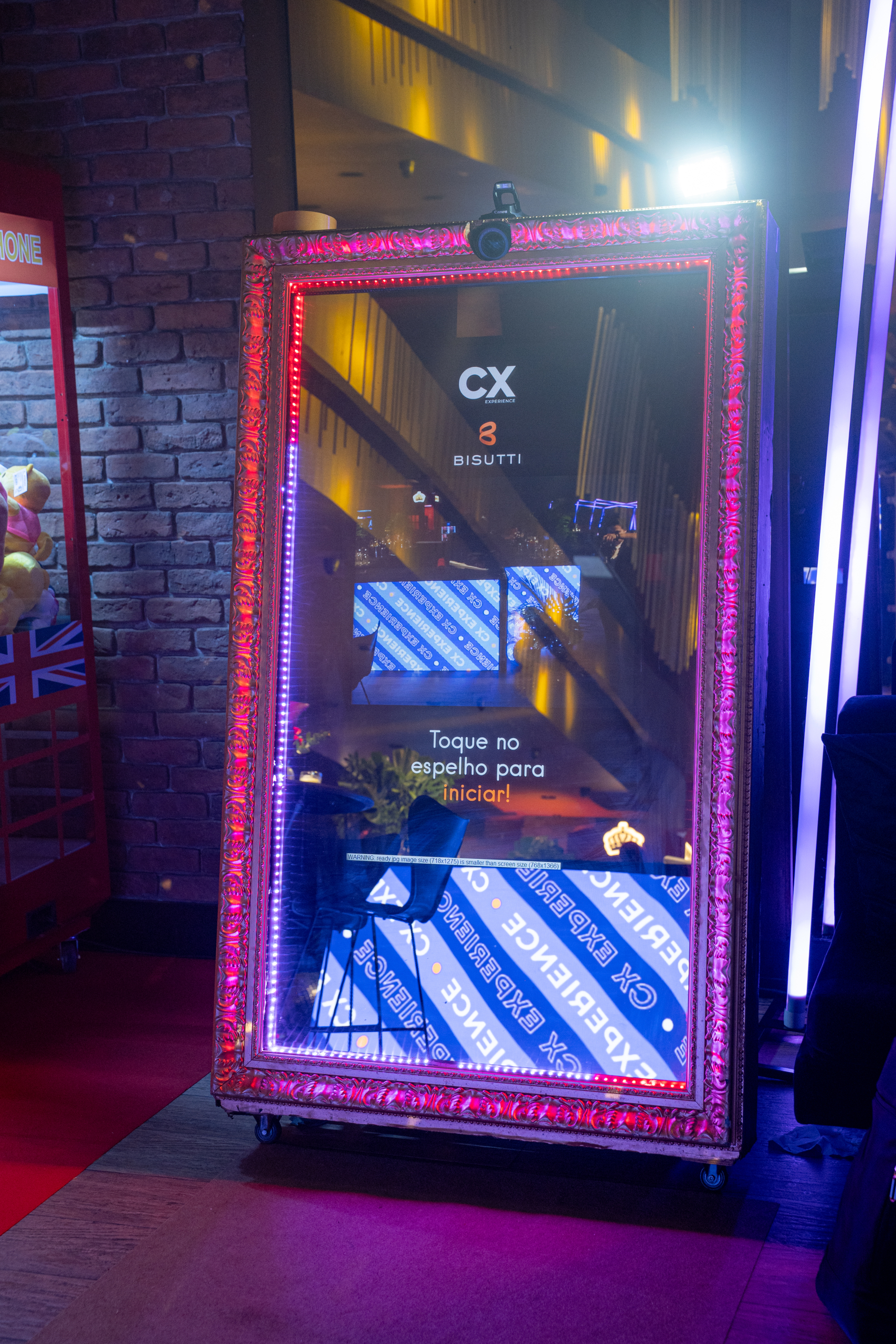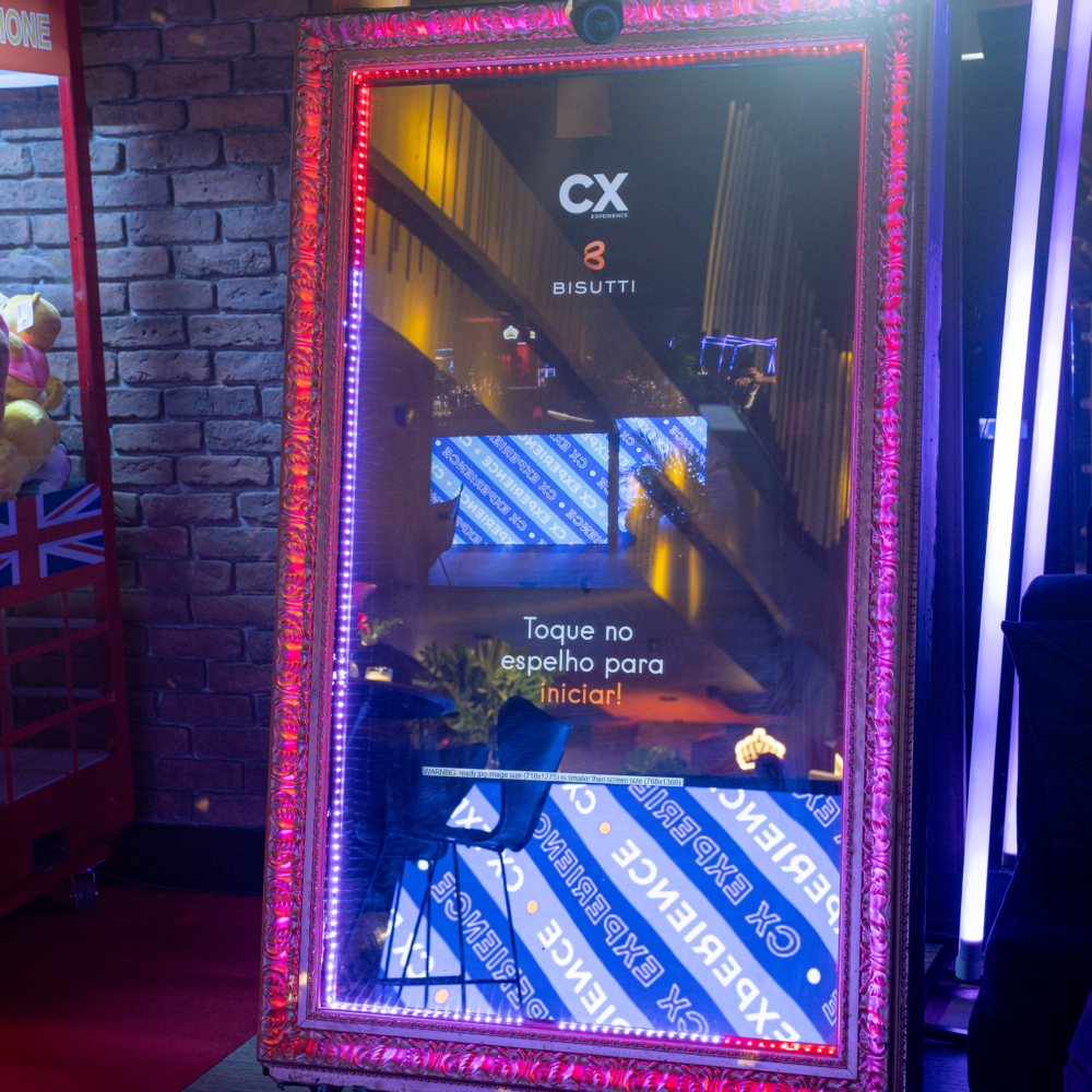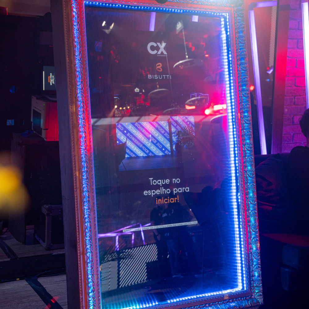 | Um espelho interativo que oferece uma experiência divertida, permitindo tirar e imprimir fotos instantaneamente. As imagens podem ser personalizadas com o tema do evento, tornando cada evento único. Espelho com led e moldura dourada, impressão |