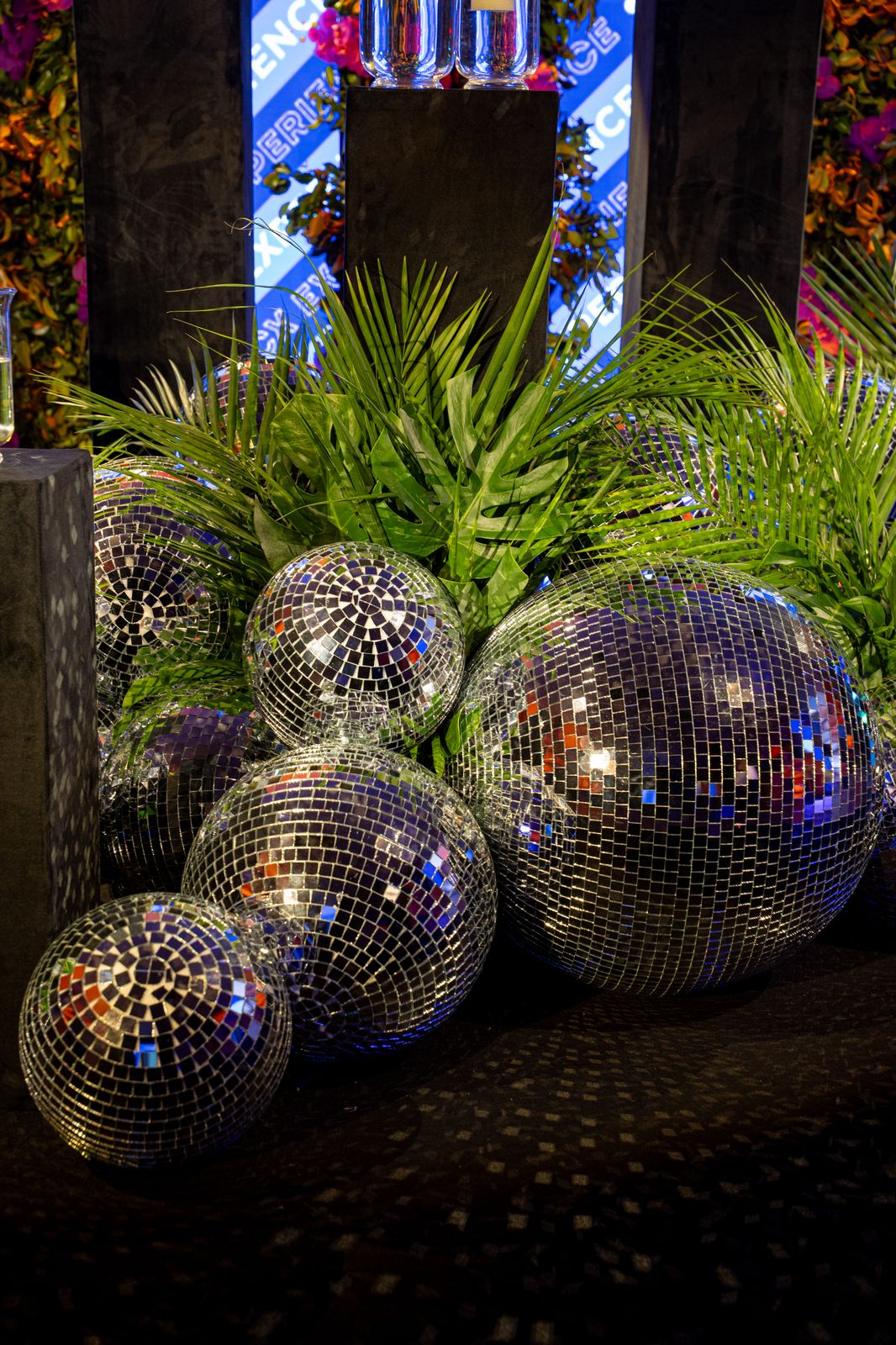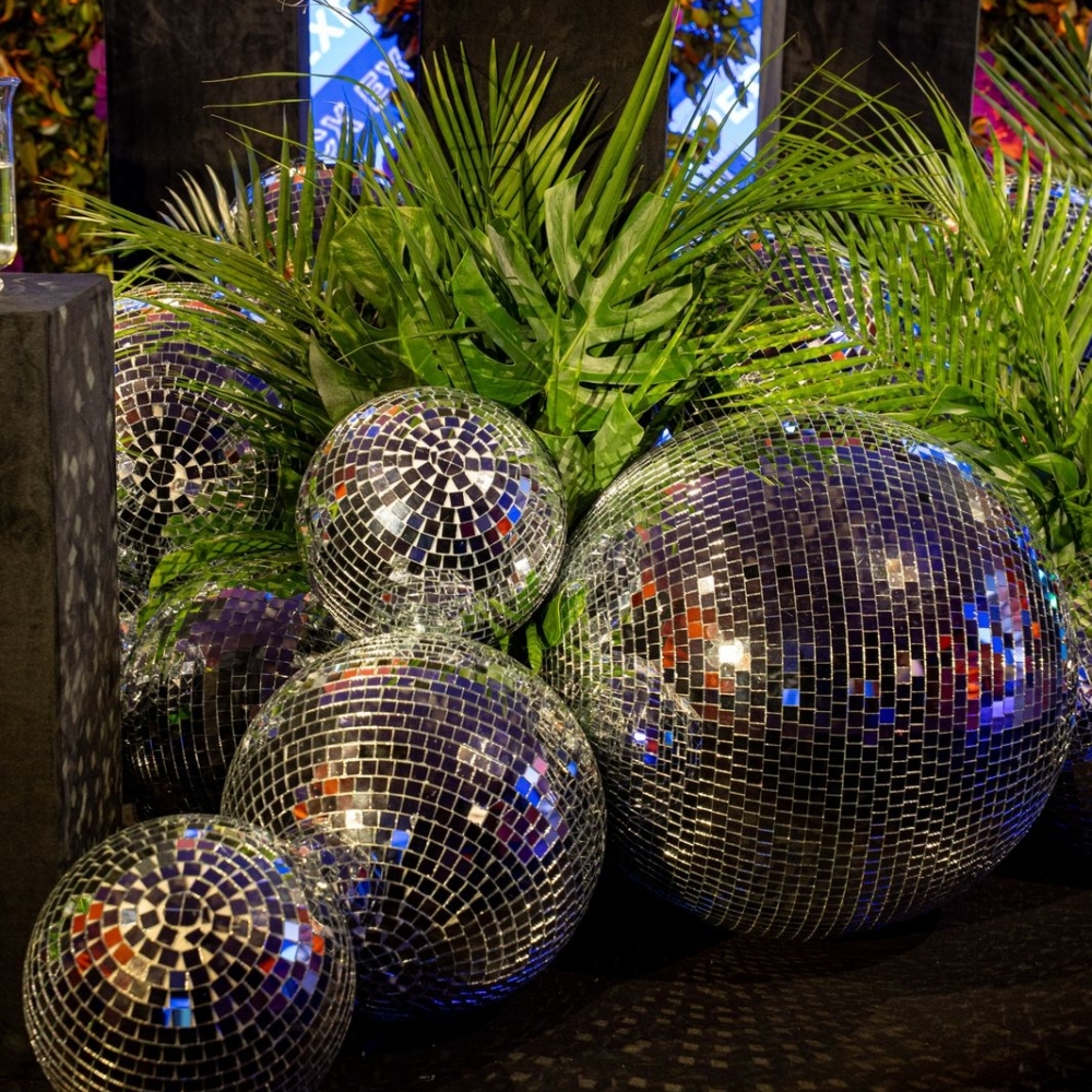 Destaque sua pista com globos espelhados personalizados em diferentes tamanhos e acabamentos. A luz refletida cria um efeito dinâmico e sofisticado, ideal para eventos noturnos com proposta moderna ou retrô.