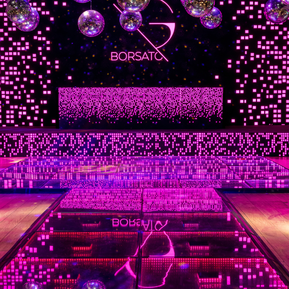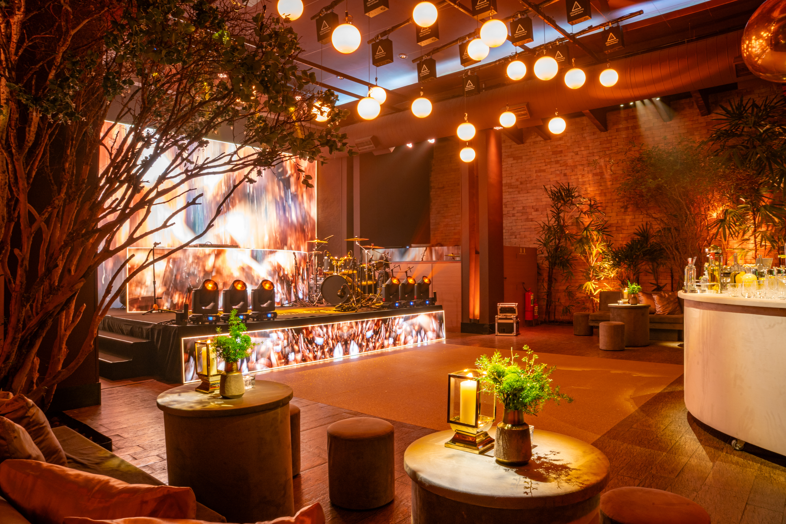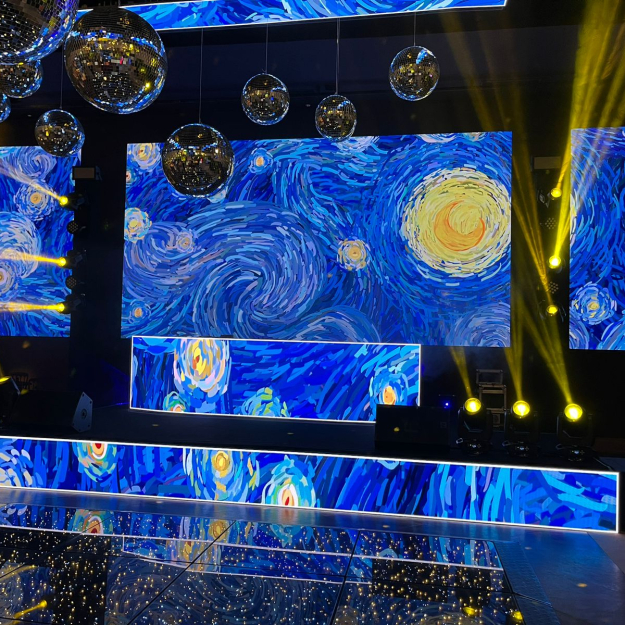 Uma cabine moderna para DJ, equipada com um painel de LED P2 curvo que combina estilo e tecnologia, elevando a experiência de entretenimento com um visual impactante e uma atmosfera vibrante.