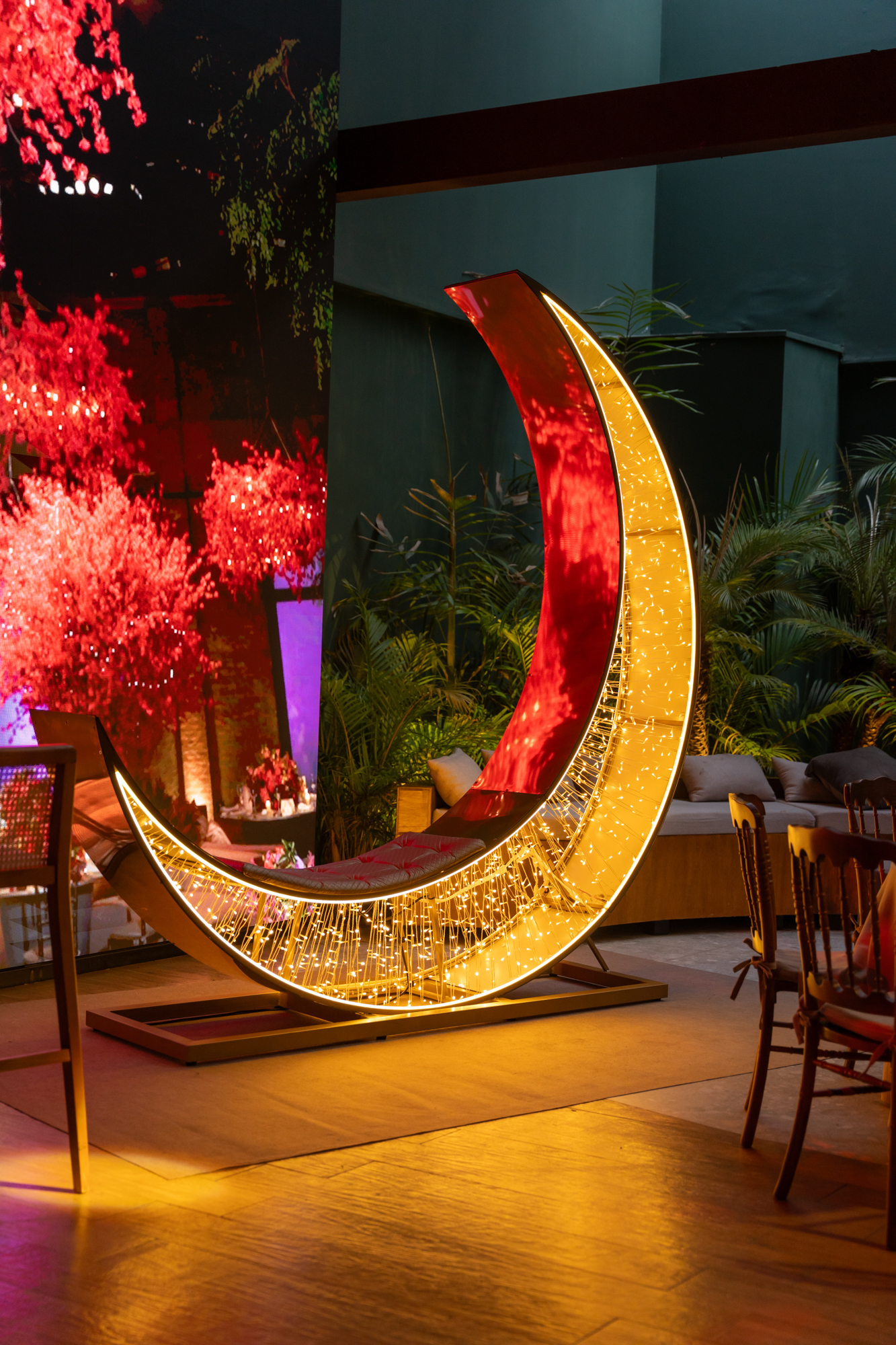 Pórtico cenográfico de entrada dupla face com comunicação visual. Acabamento Premium feito em estrutura cenográfica autoportante e duplaface.