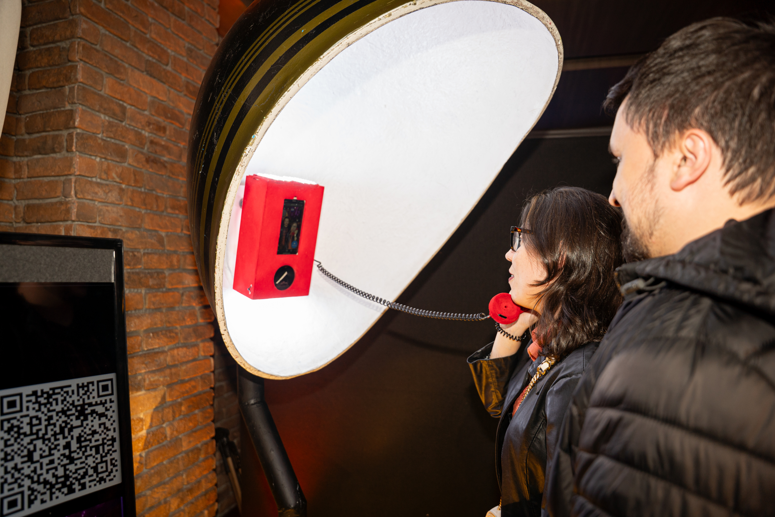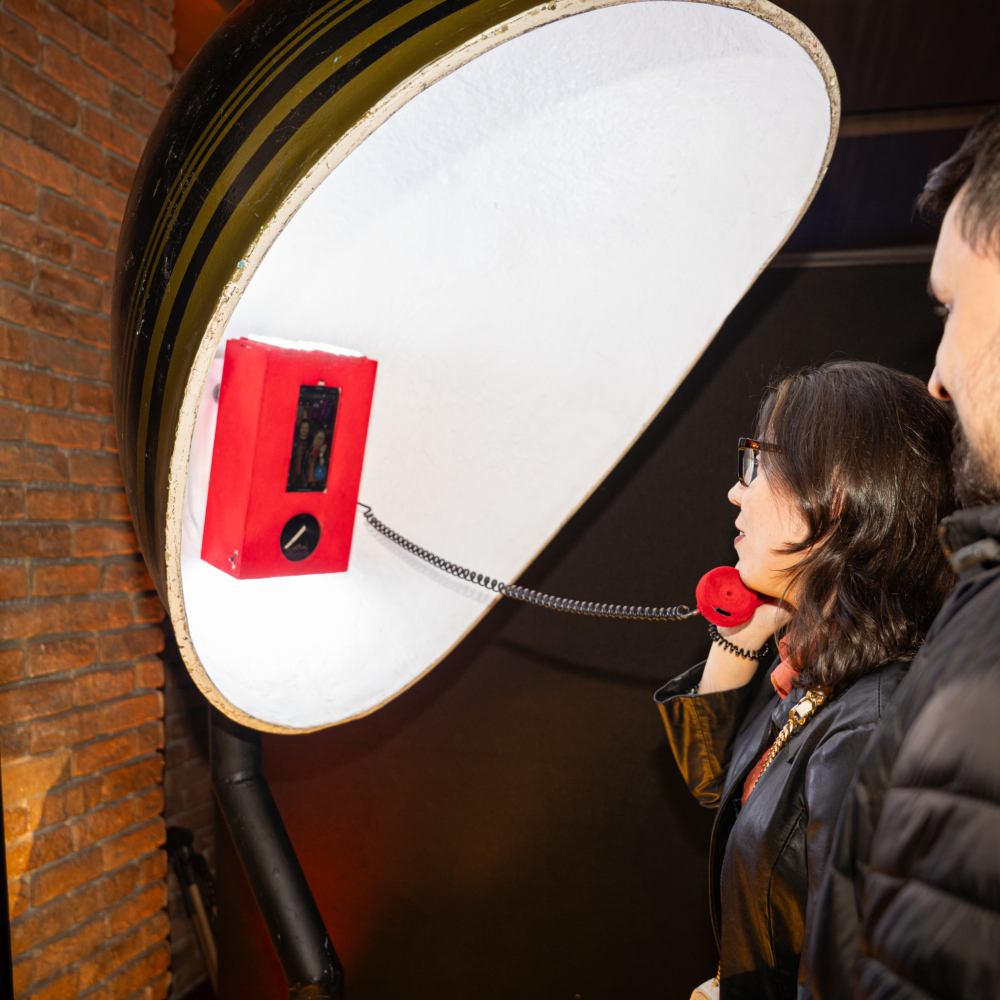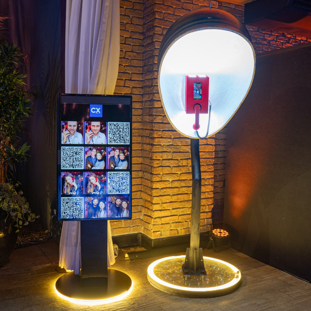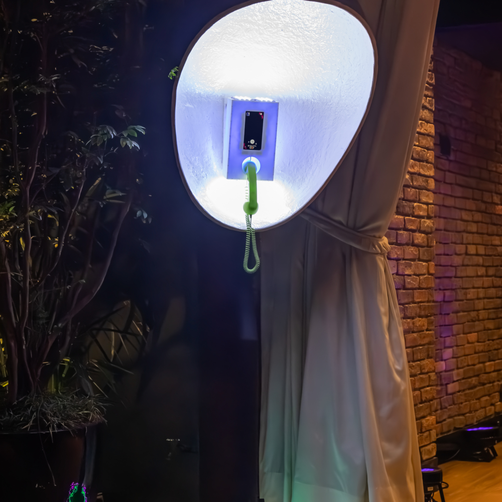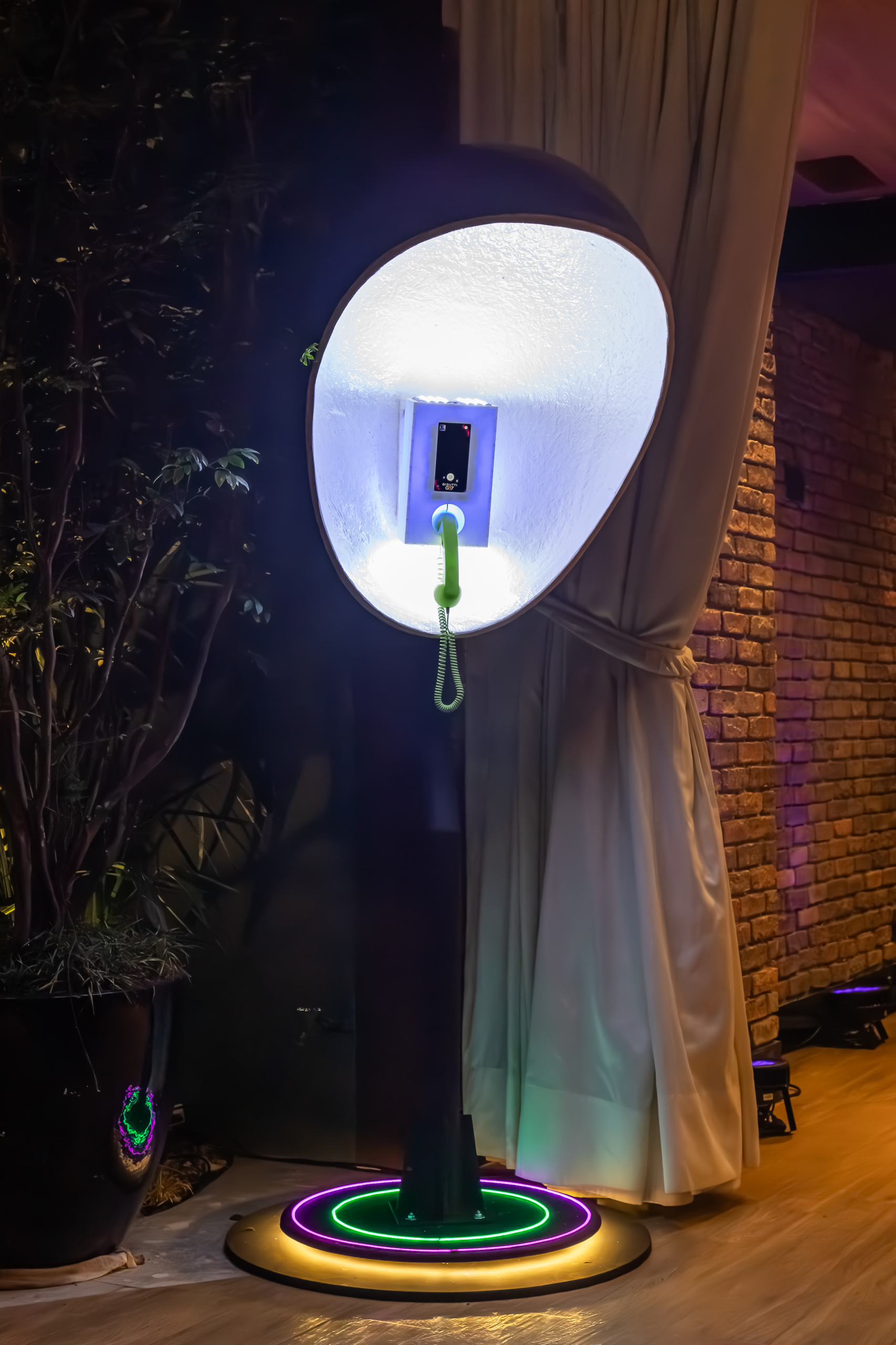 O orelhão de LED, iluminado por luzes vibrantes, lembra os antigos telefones públicos e é perfeito para recados e fotos. Ele combina nostalgia com uma estética moderna e deslumbrante.