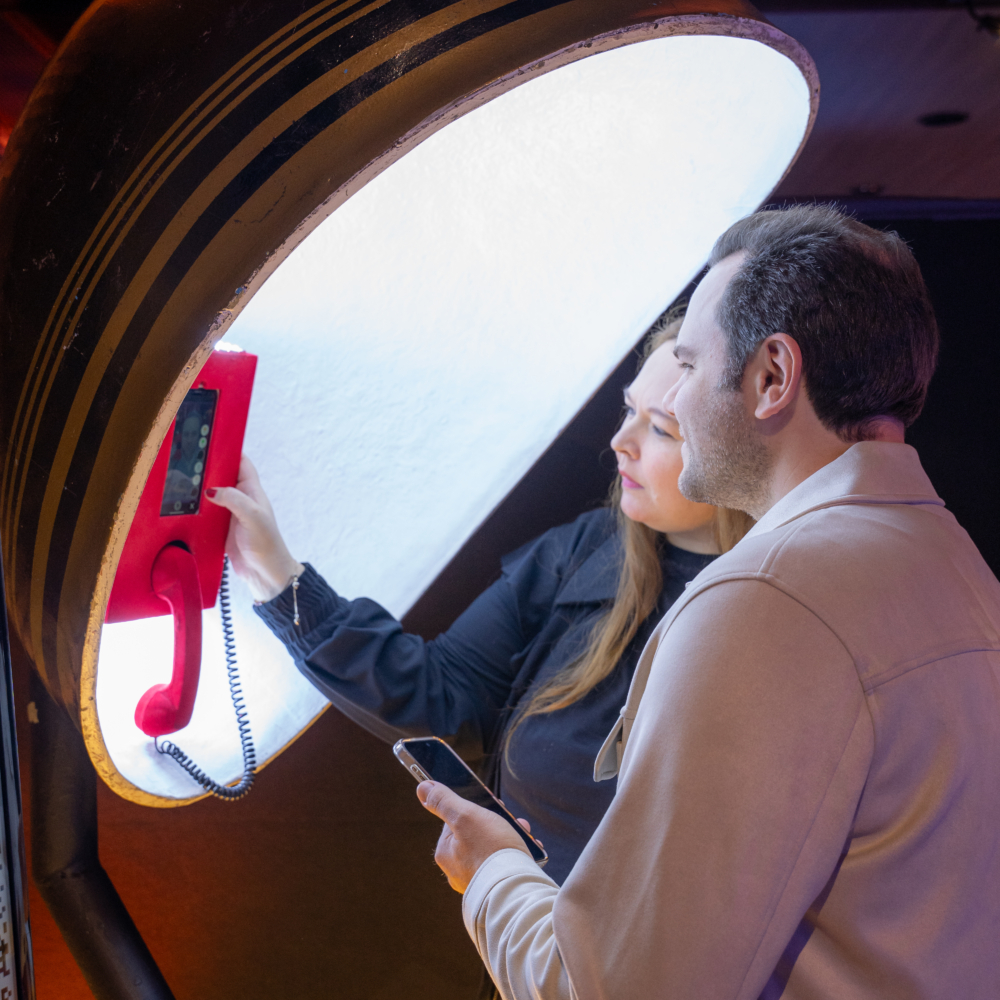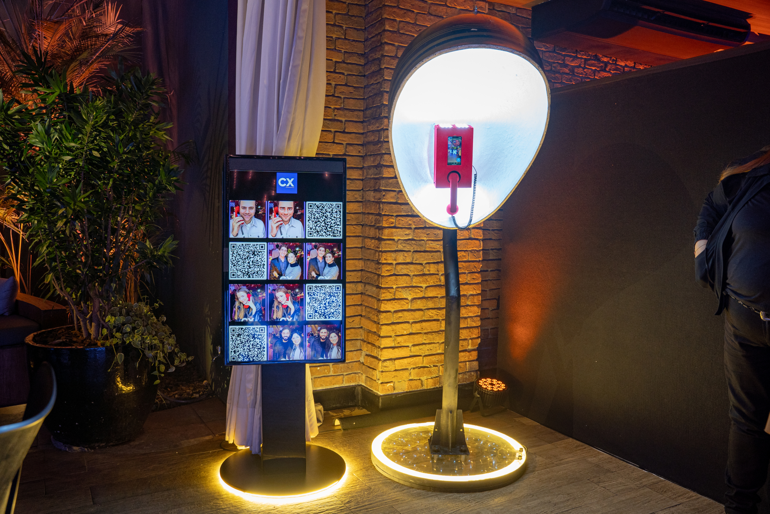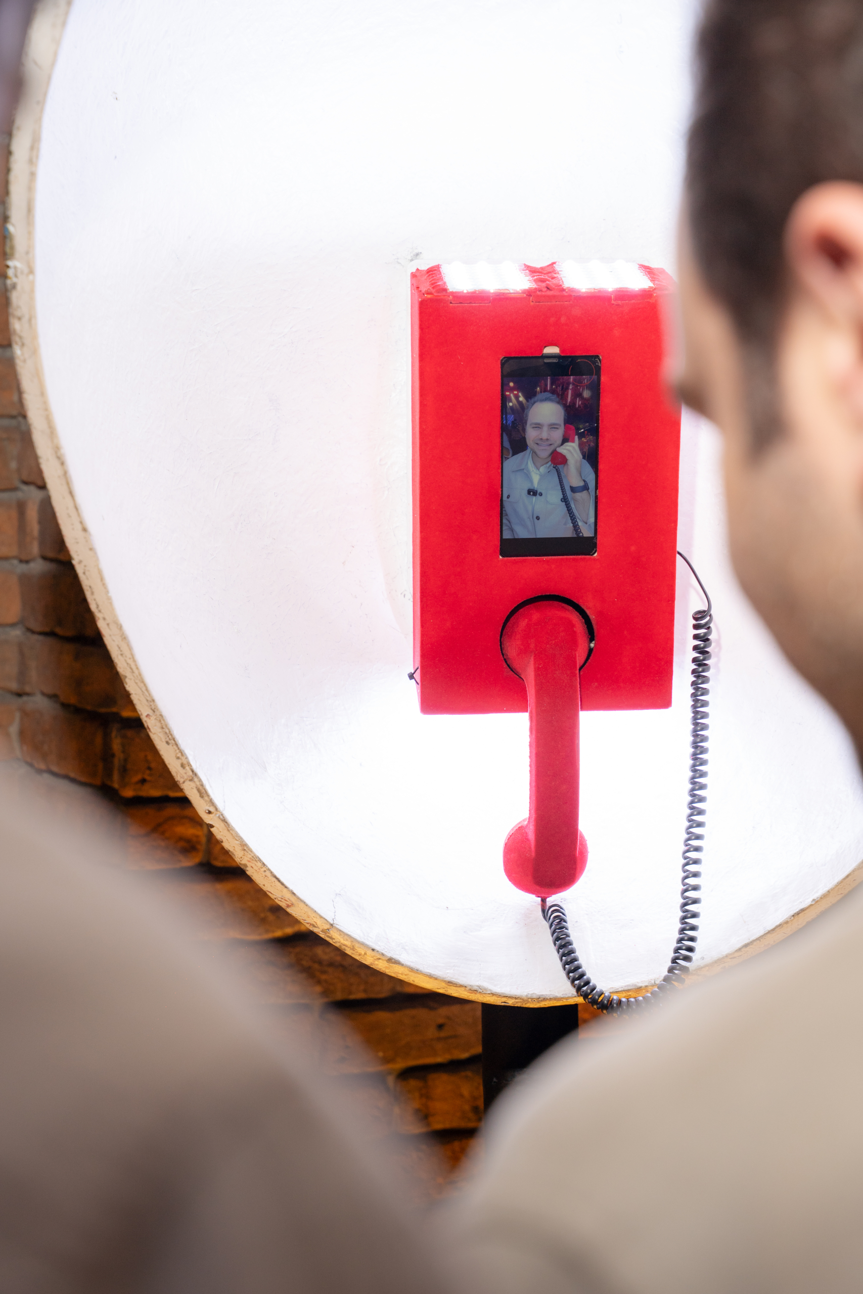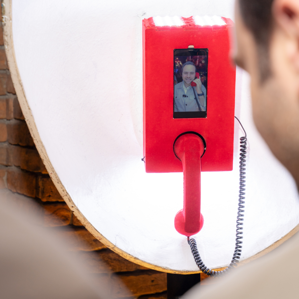 O orelhão de LED, iluminado por luzes vibrantes, lembra os antigos telefones públicos e é perfeito para recados e fotos. Ele combina nostalgia com uma estética moderna e deslumbrante.