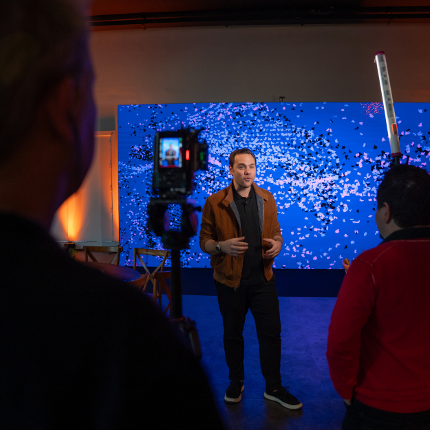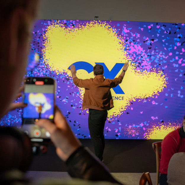 Conforme os convidados se movimentam, o conteúdo descortina em primeiro plano em motion muda e revela a imagem/logo de fundo da empresa, identidade visual do evento ou vídeo curto animado com elemento visual da empresa.