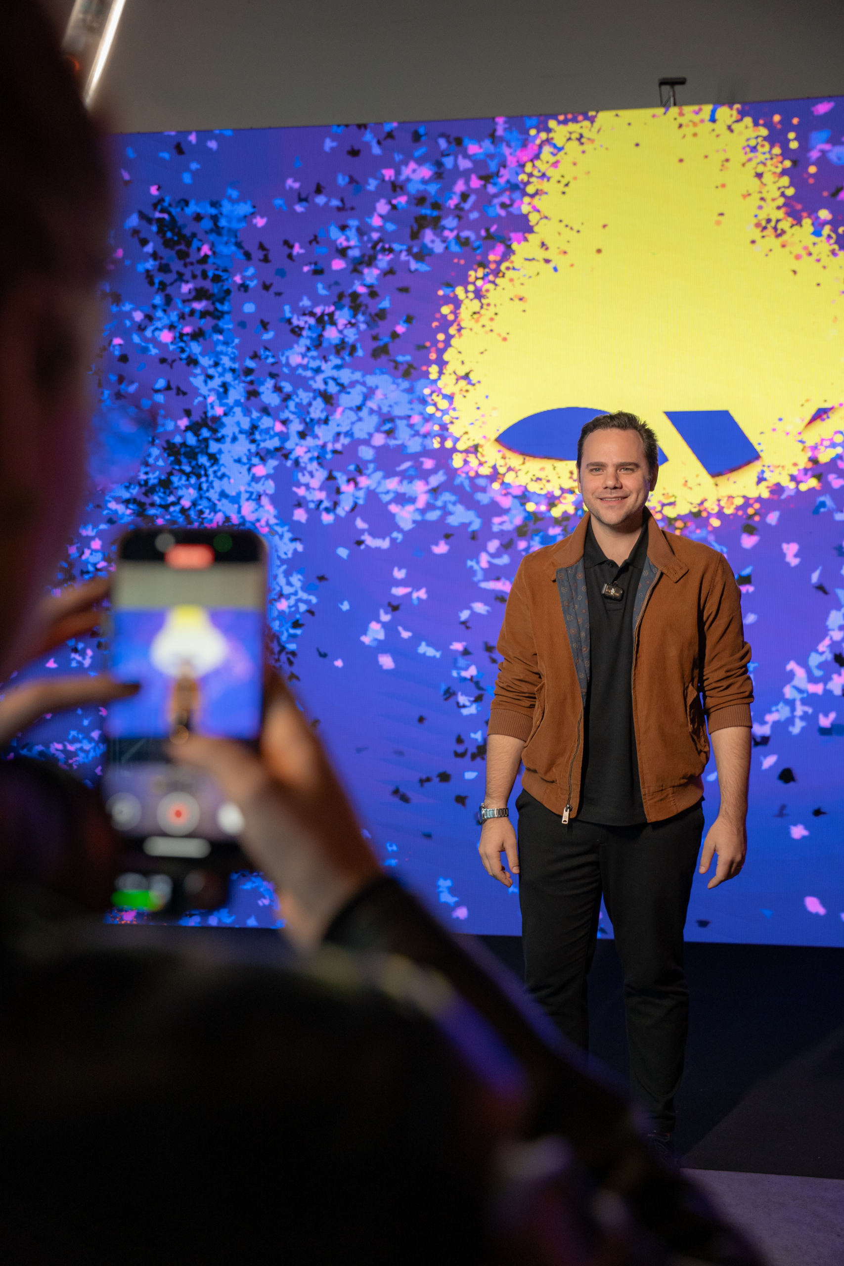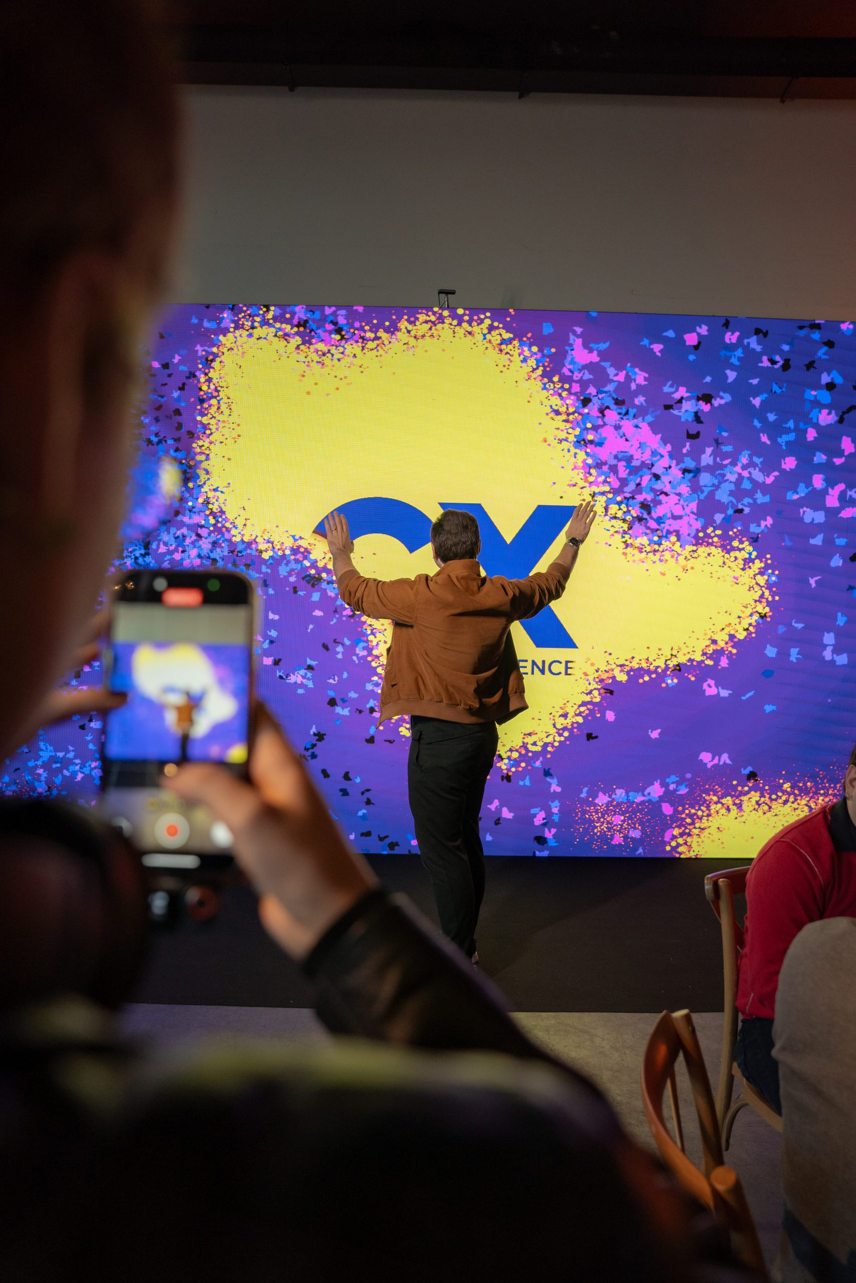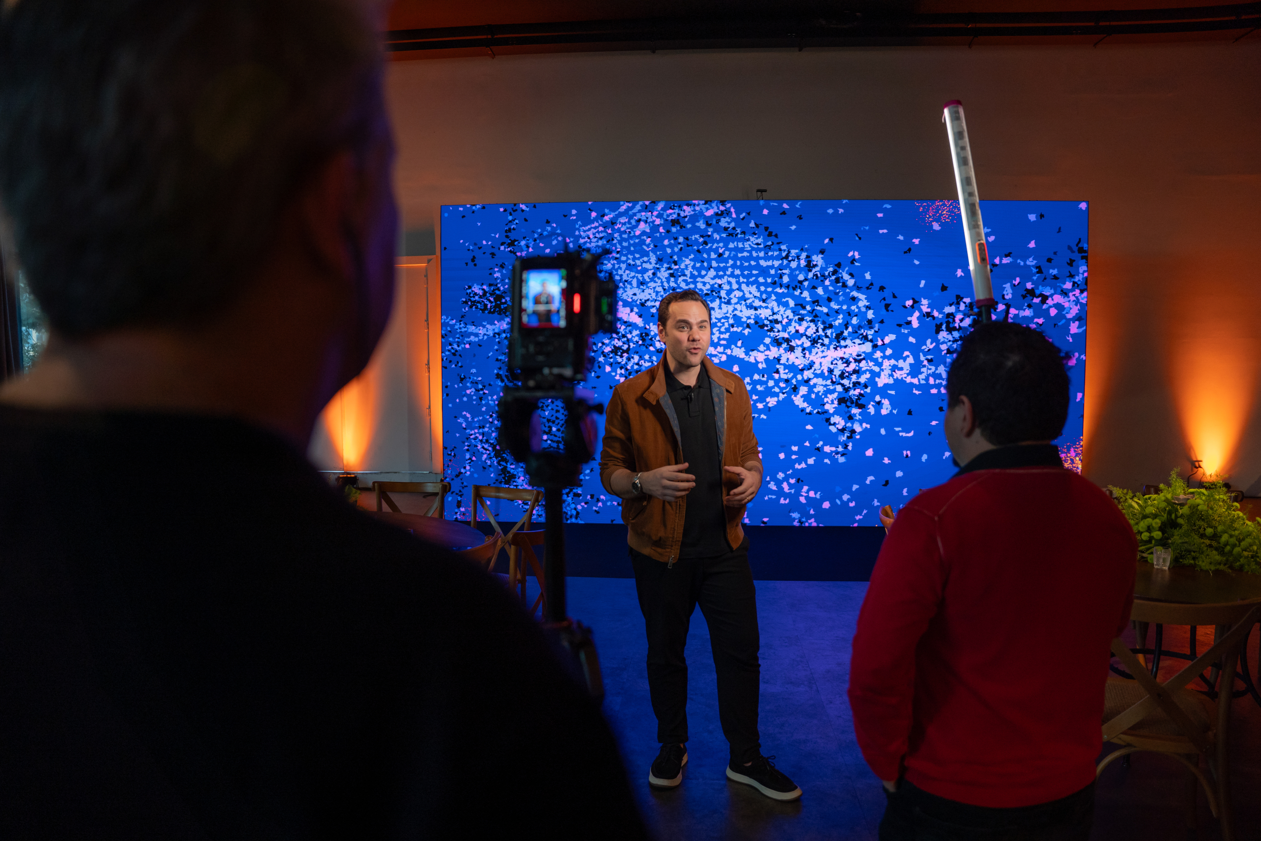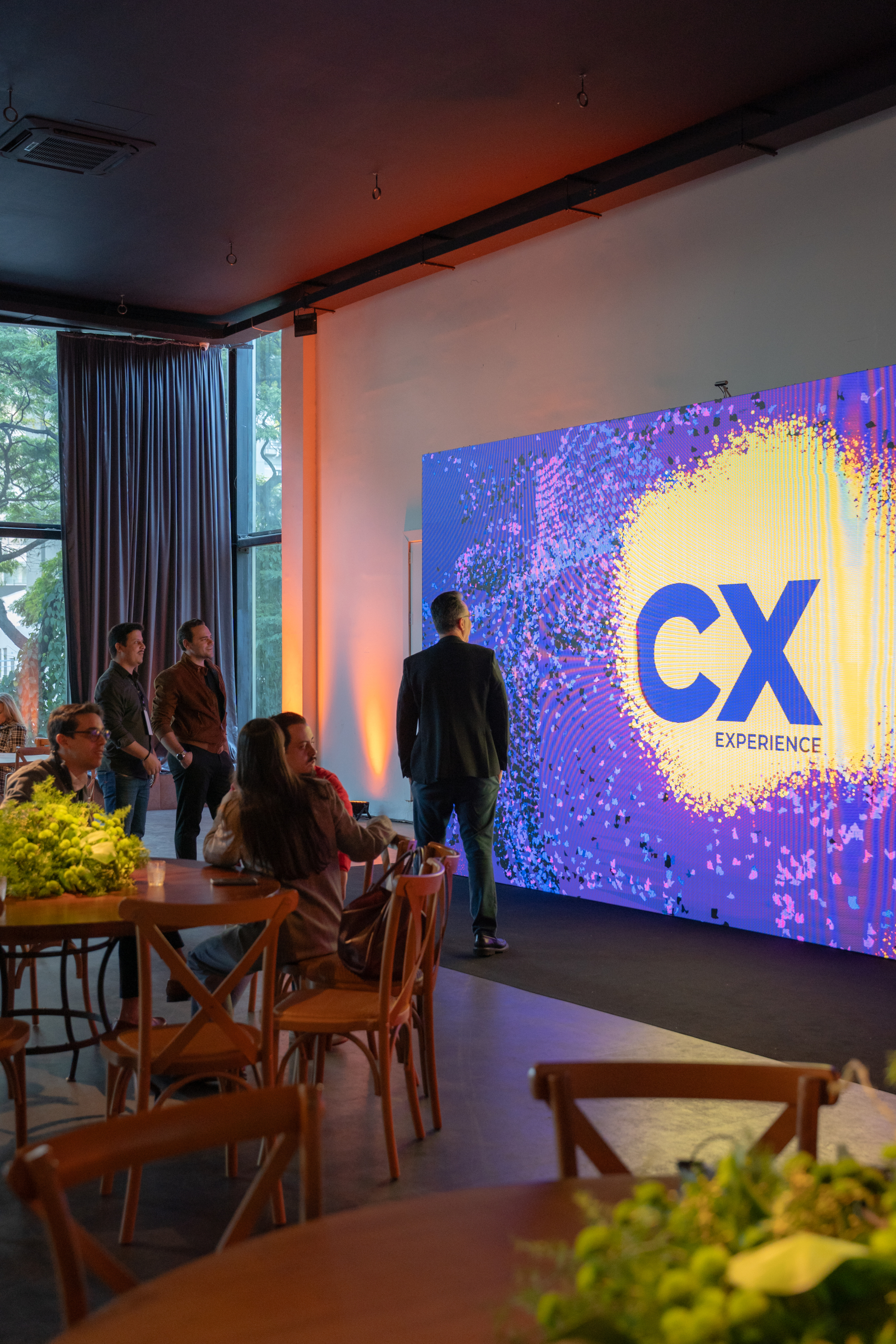 Conforme os convidados se movimentam, o conteúdo descortina em primeiro plano em motion muda e revela a imagem/logo de fundo da empresa, identidade visual do evento ou vídeo curto animado com elemento visual da empresa.