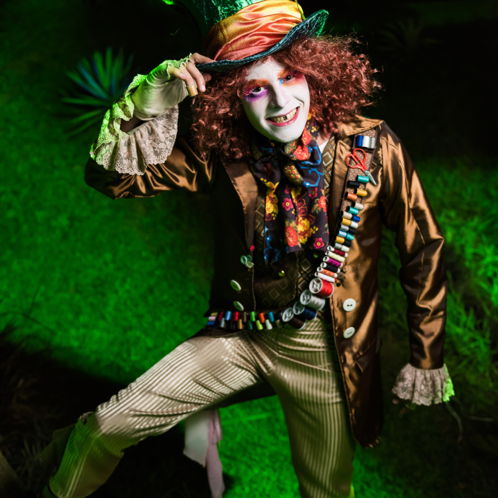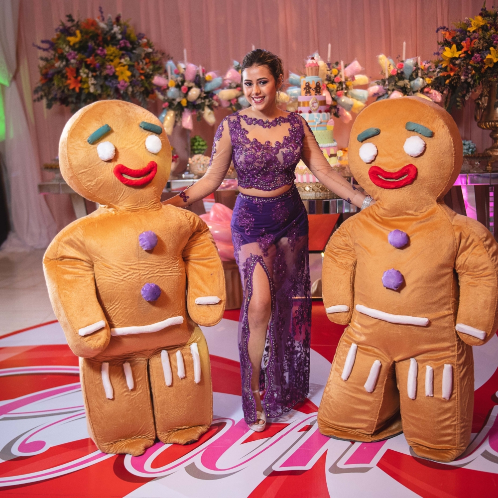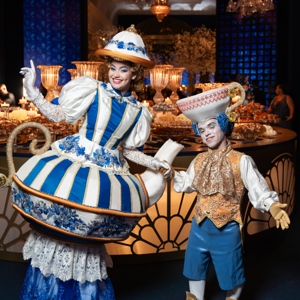 Personagens com figurinos premium e presença marcante criam uma experiência única desde a chegada dos convidados até os momentos mais animados da festa.