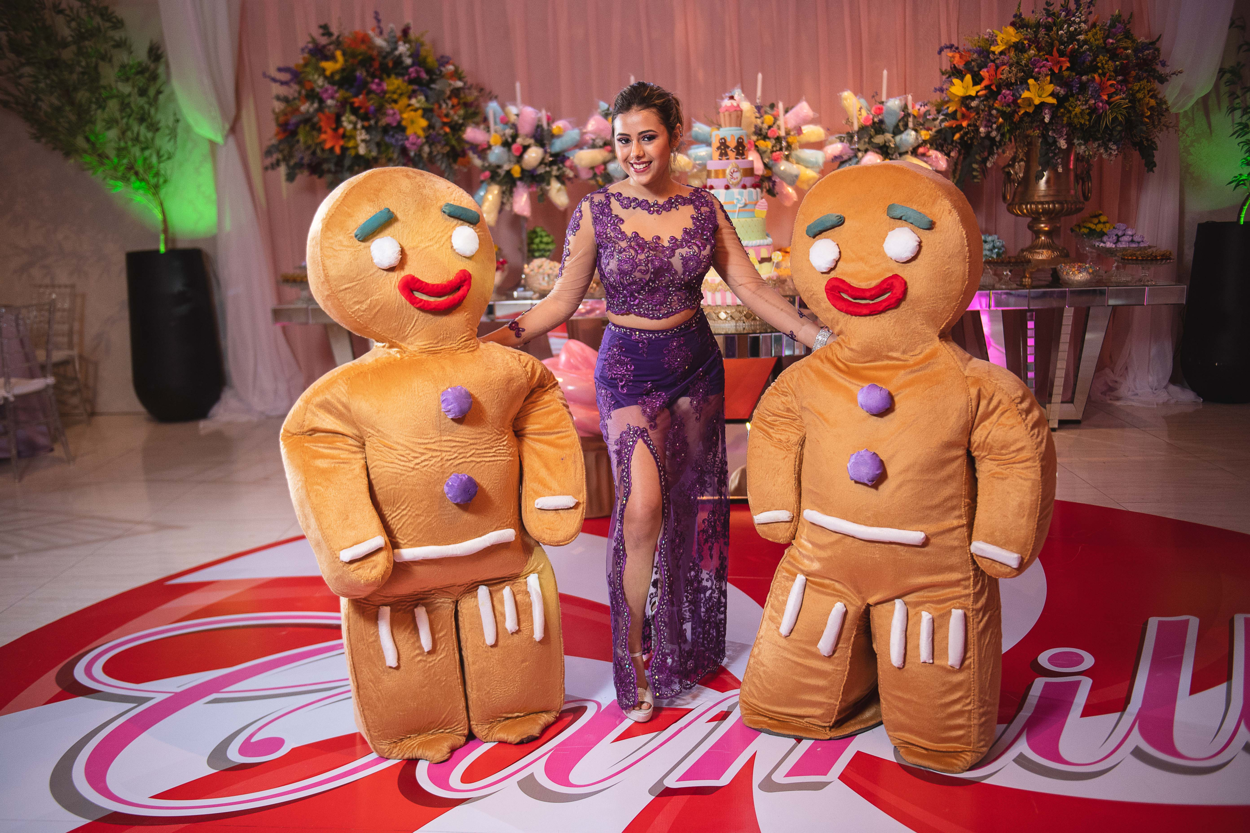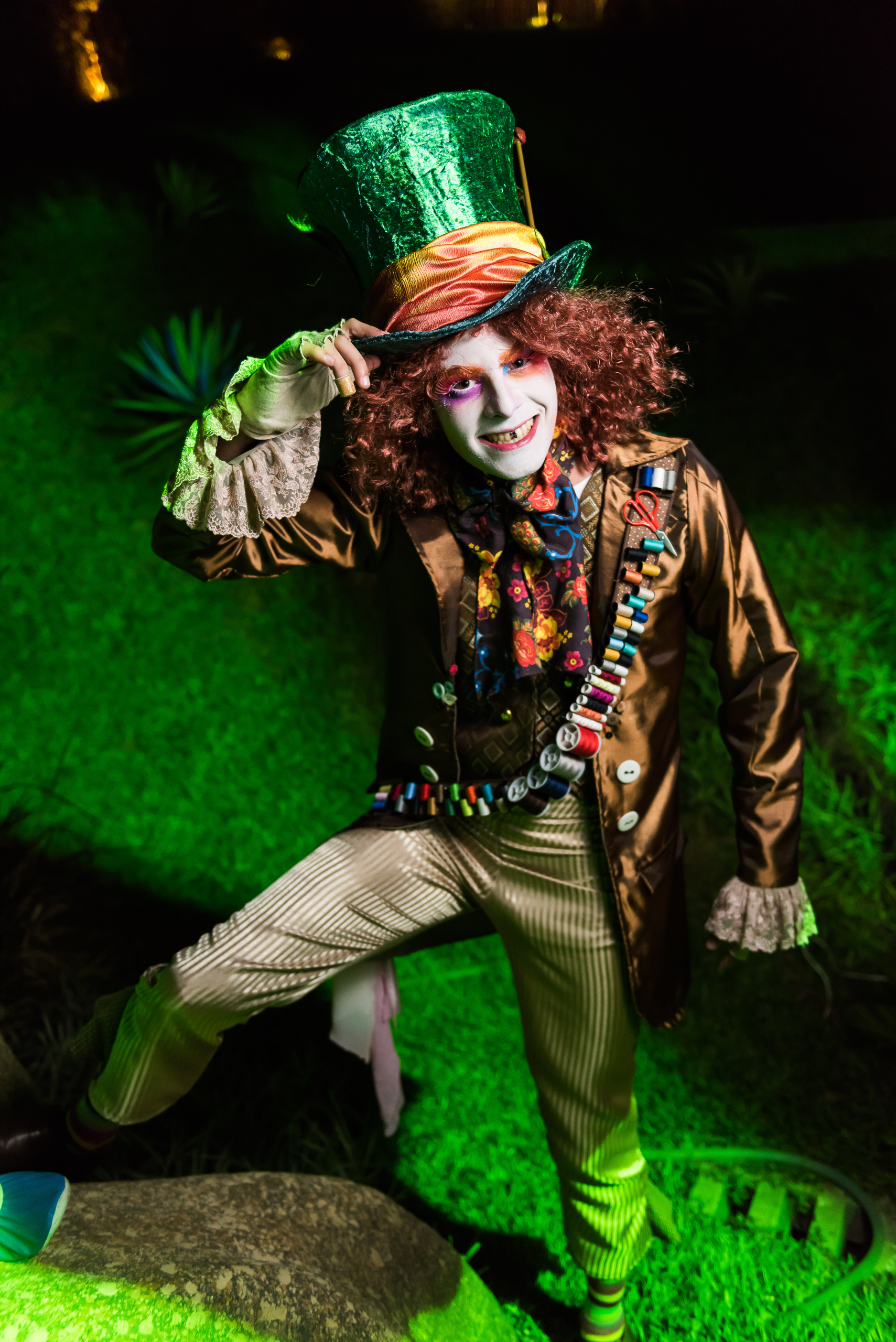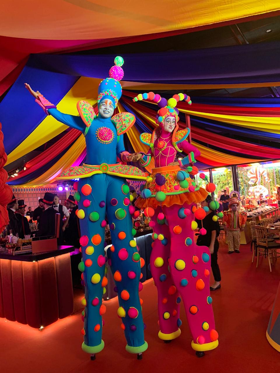 Personagens com figurinos premium e presença marcante criam uma experiência única desde a chegada dos convidados até os momentos mais animados da festa.