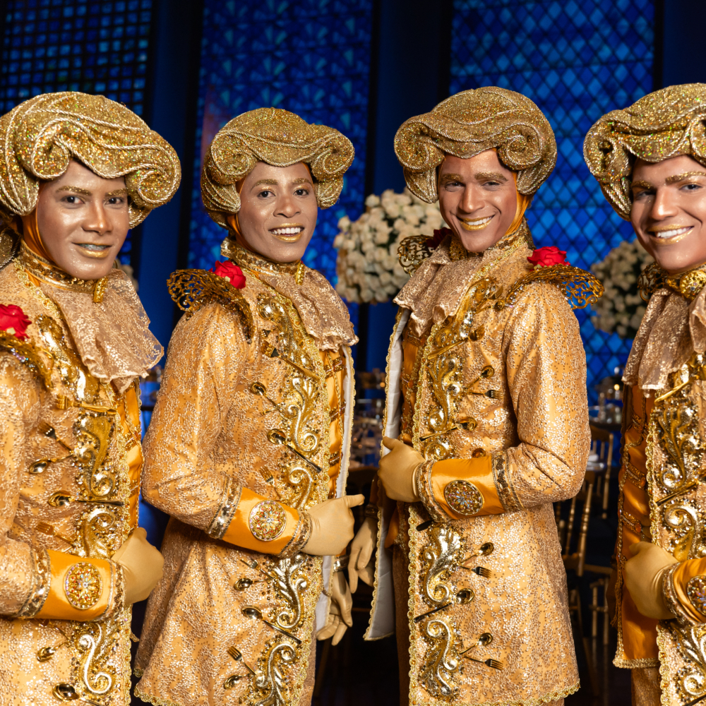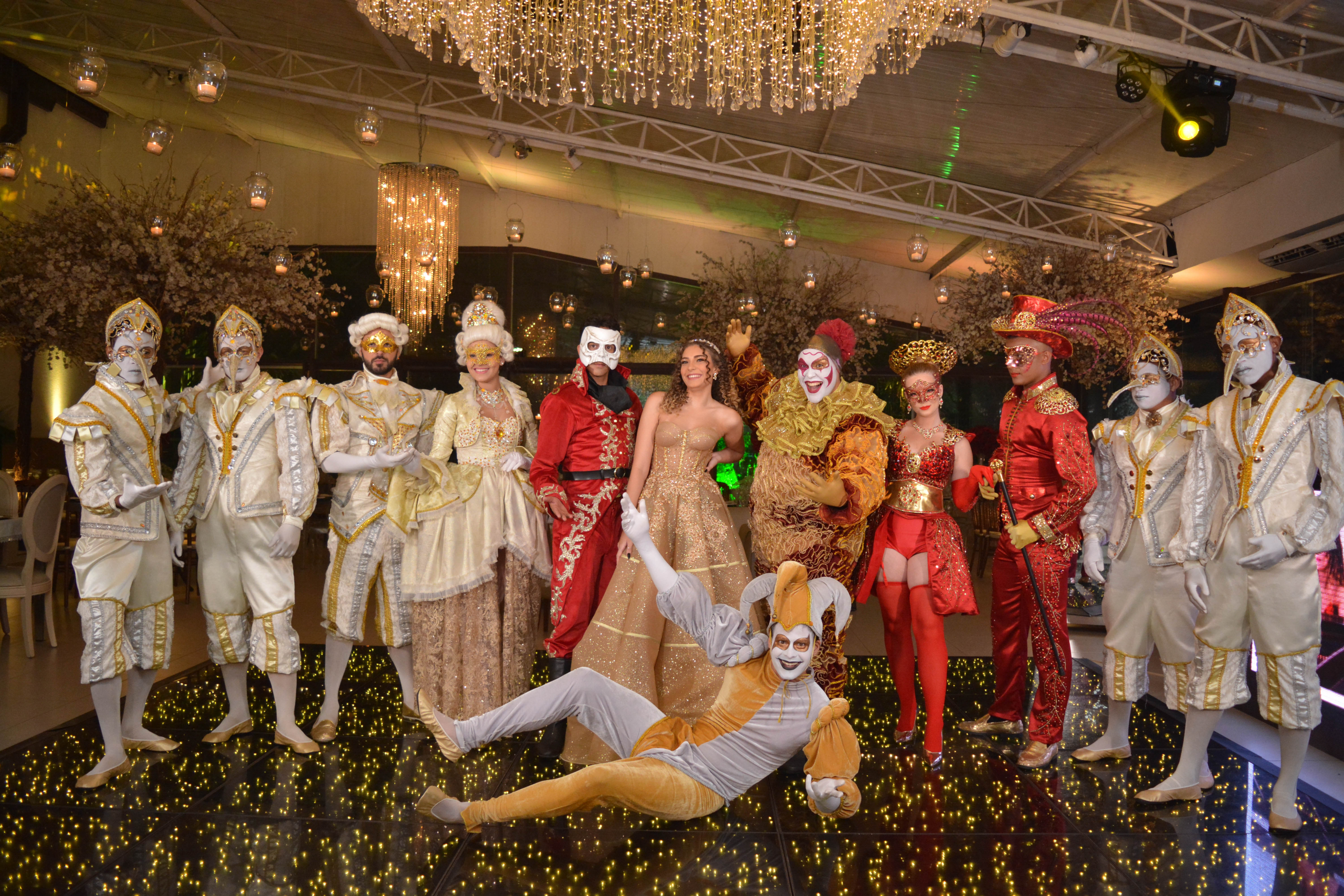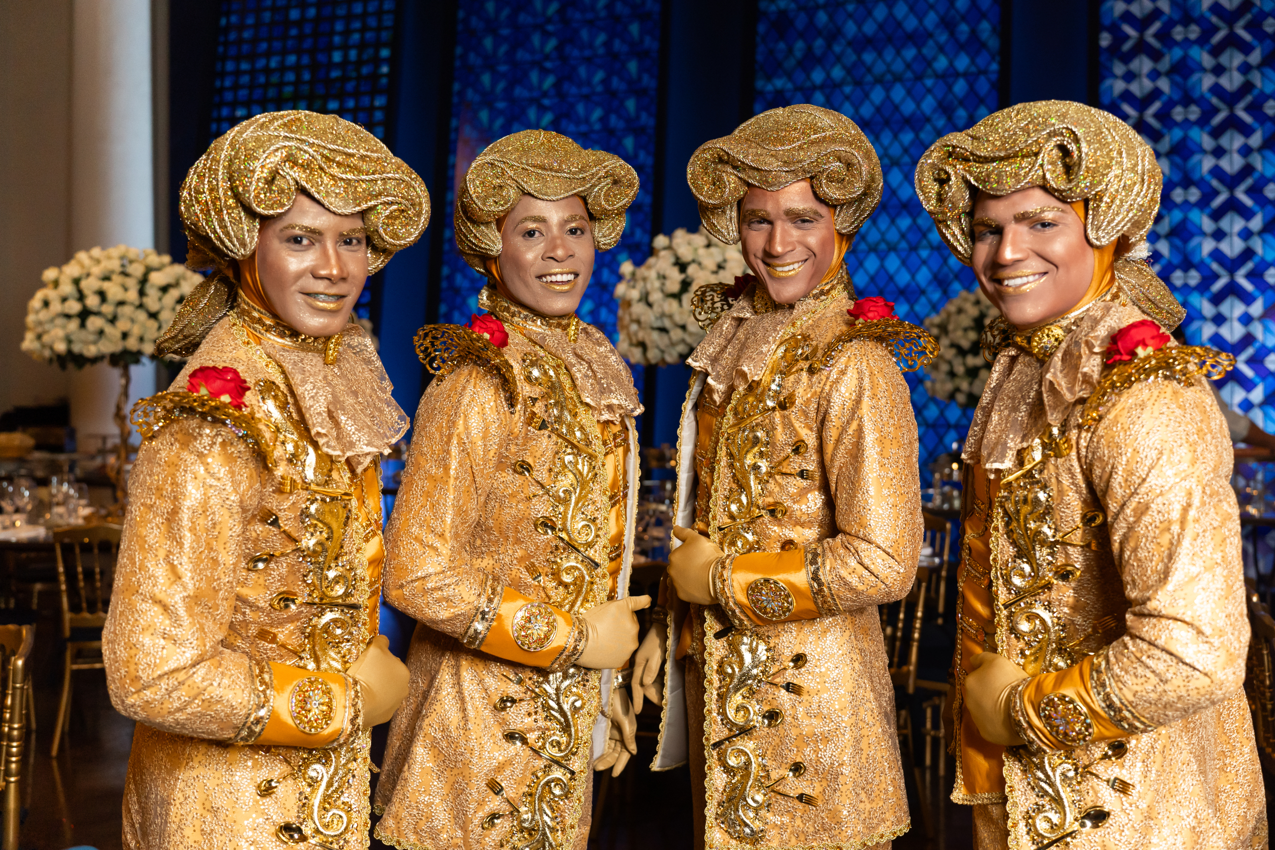 Artistas especializados interagem com o público, posam para fotos com anfitriões e convidados, e compõem visualmente o ambiente com elegância e criatividade.
