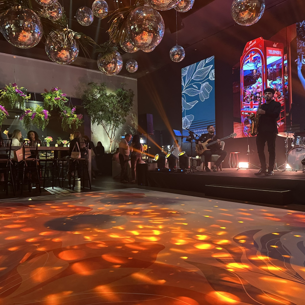 A pista não é adesivada ao piso, e sim feita com forração cenográfica de alto acabamento e aplicação de superfície personalizada impressa em 4 cores por cima com identidade visual do evento e acabamento de finalização superior.