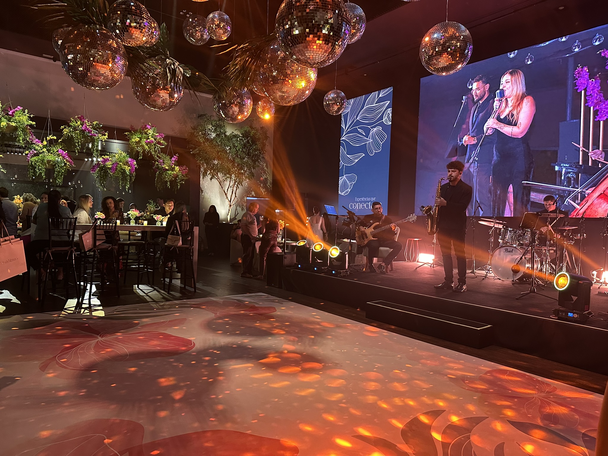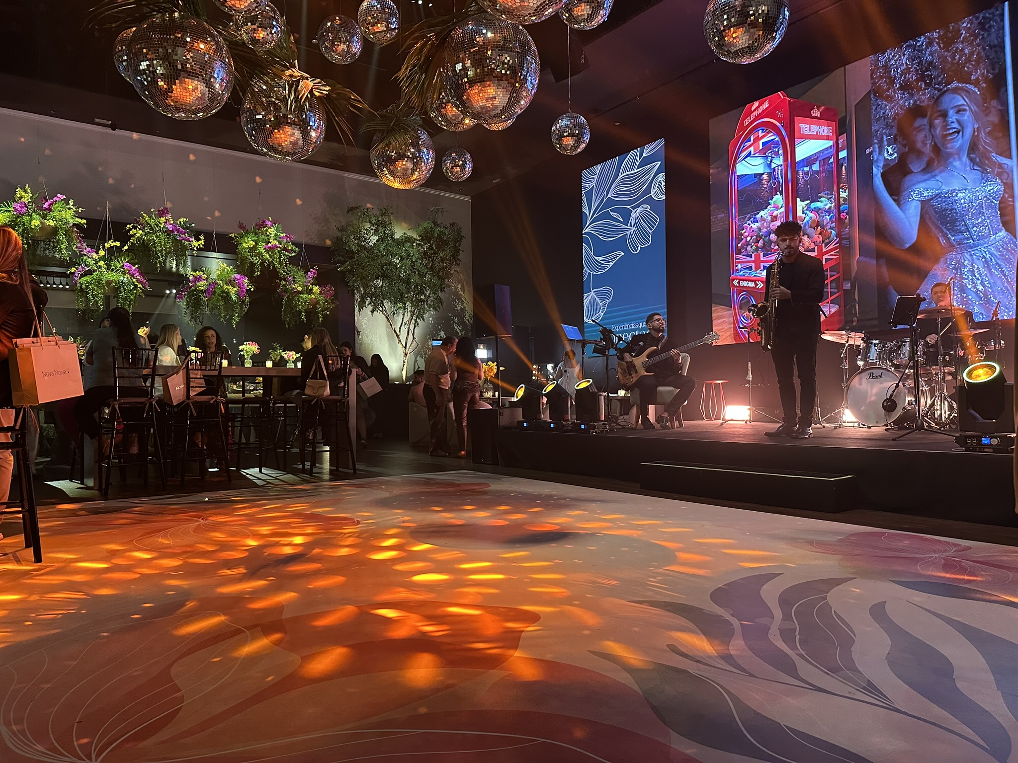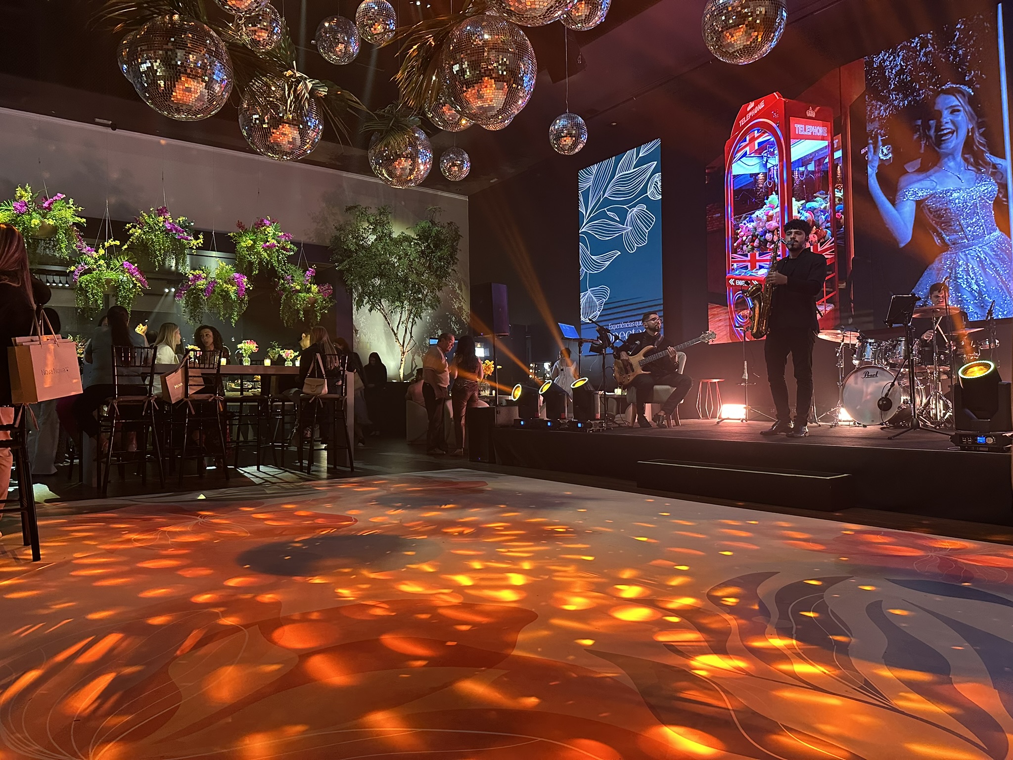 A pista não é adesivada ao piso, e sim feita com forração cenográfica de alto acabamento e aplicação de superfície personalizada impressa em 4 cores por cima com identidade visual do evento e acabamento de finalização superior.