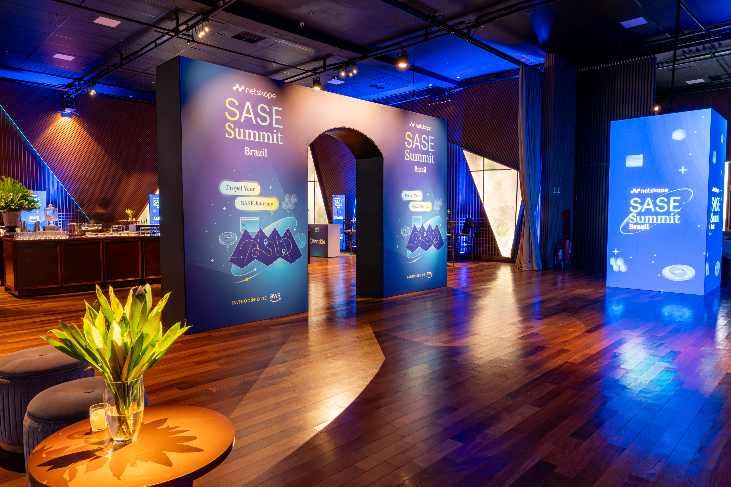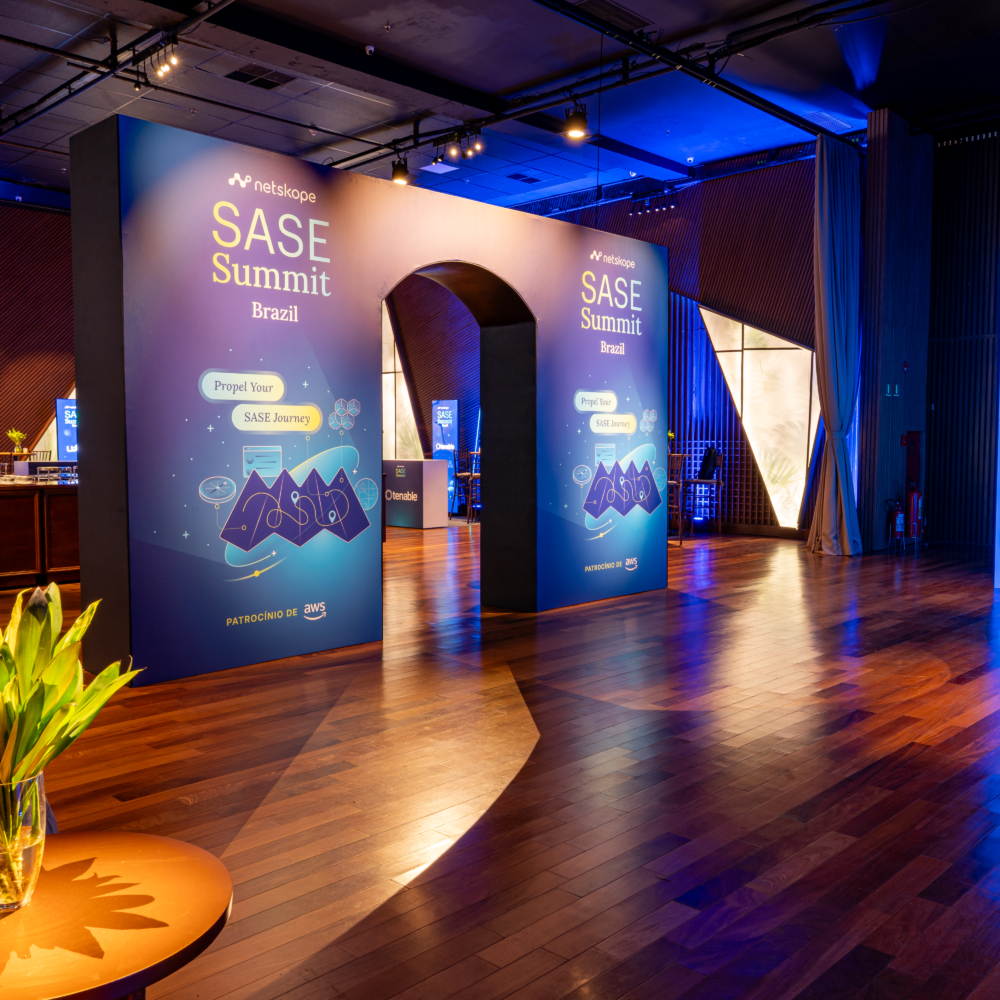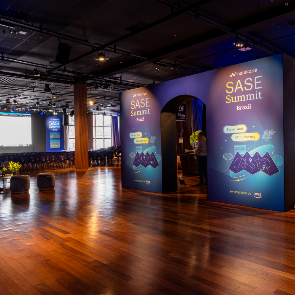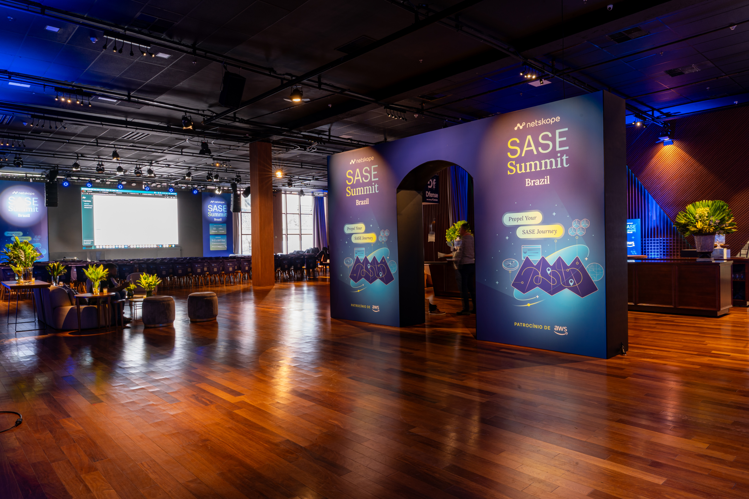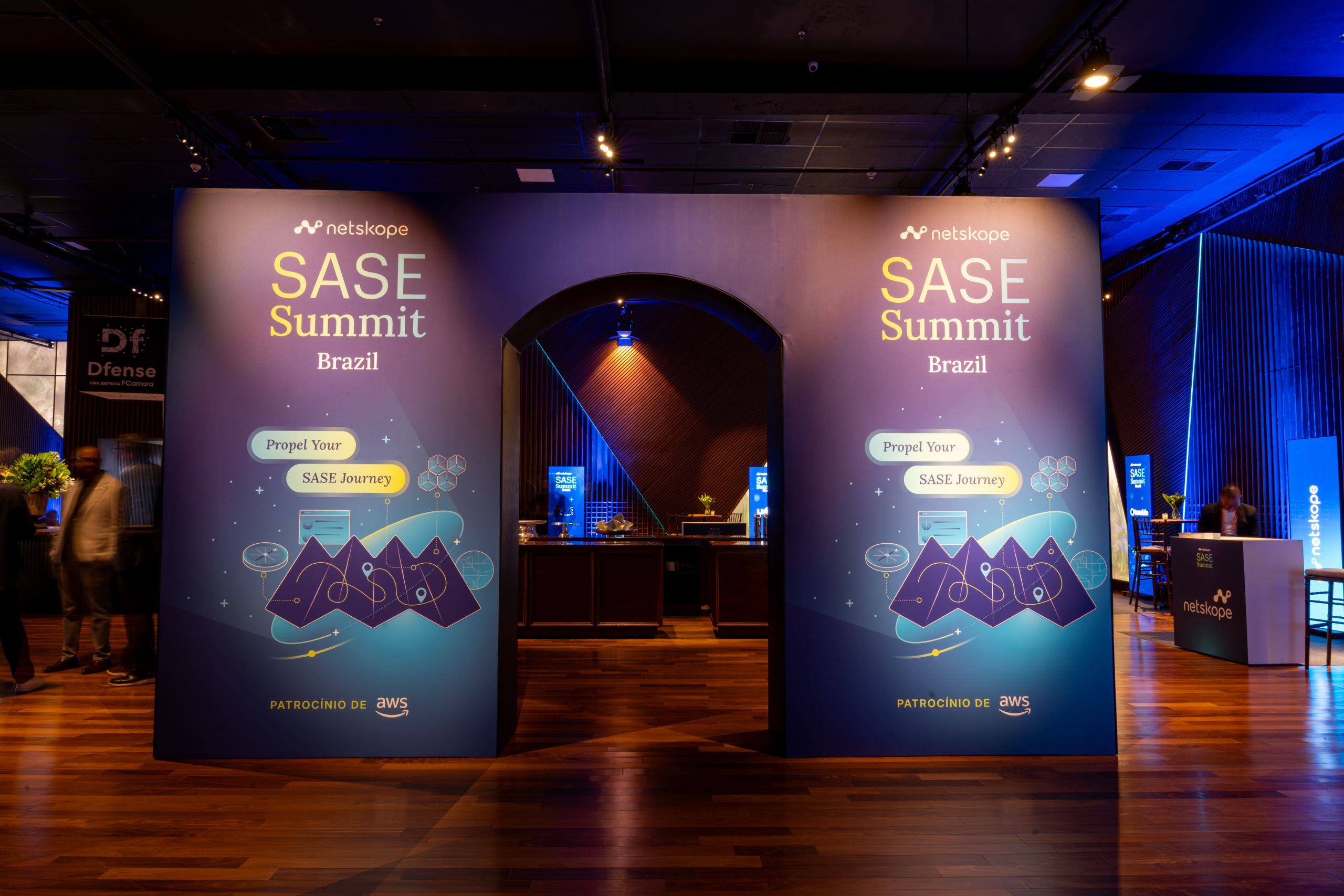 Pórtico cenográfico de entrada dupla face com comunicação visual. Acabamento Premium feito em estrutura cenográfica autoportante e duplaface.