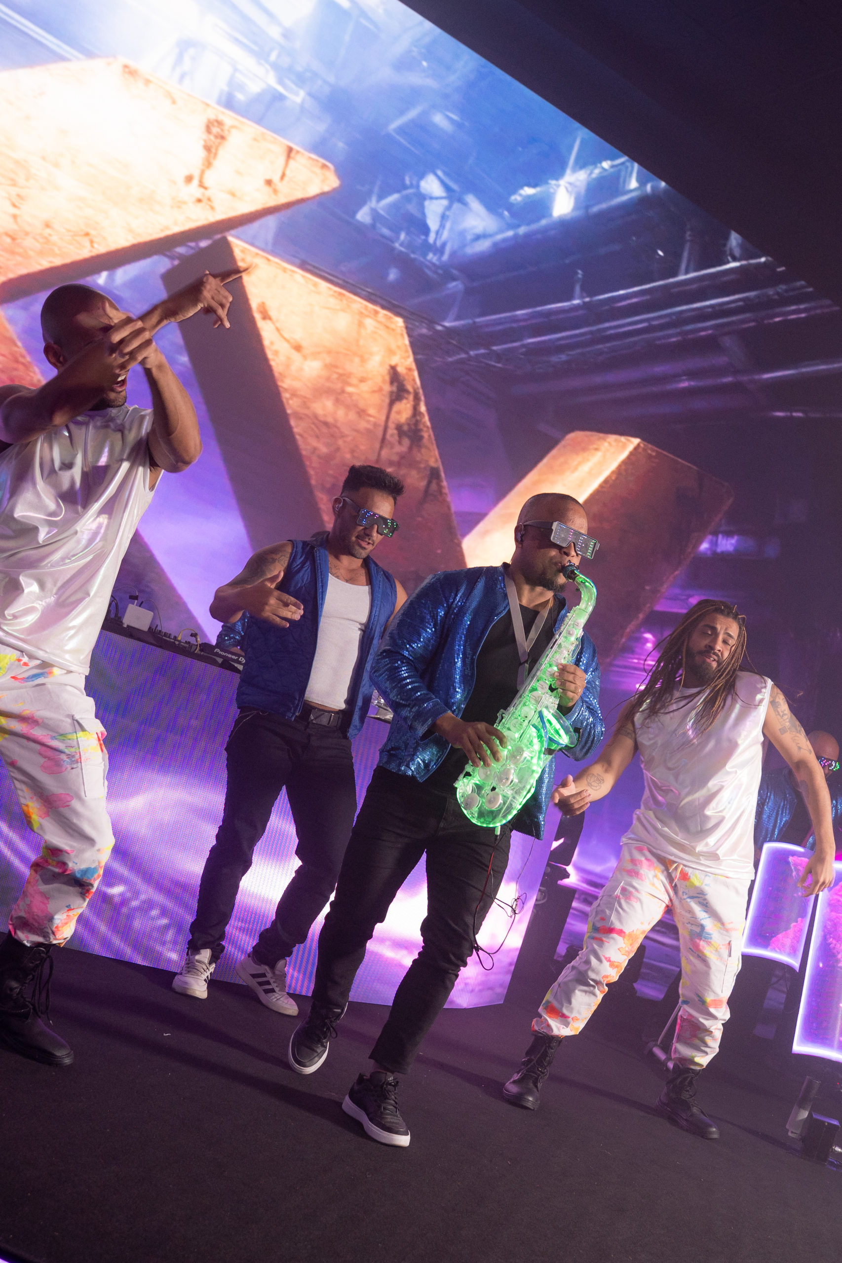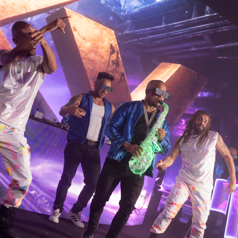 Formação com quatro integrantes sendo, um saxofonista, um violinista, um percussionista e um animador. Consultar especialista para valores.