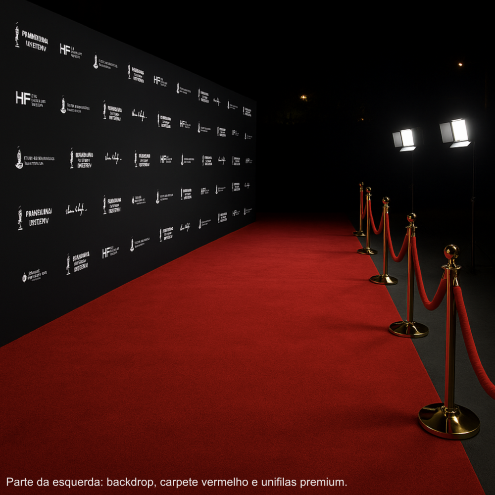 Lado esquerdo: backdrop com identidade visual do evento (ou logos das empresas) com tapete vermelho para os convidados posarem na frente, com unifila premium dourado e vermelho.