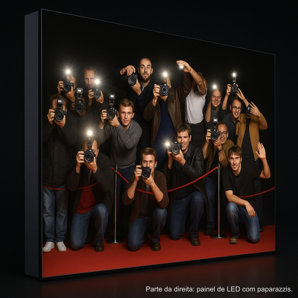 Lado direito: Painel de led como backdrop com imagens de paparazzis tirando várias fotos com flashes, simulando para o convidado o efeito das celebridades com paparazzis em grandes eventos como Oscar, o MET Gala e etc.