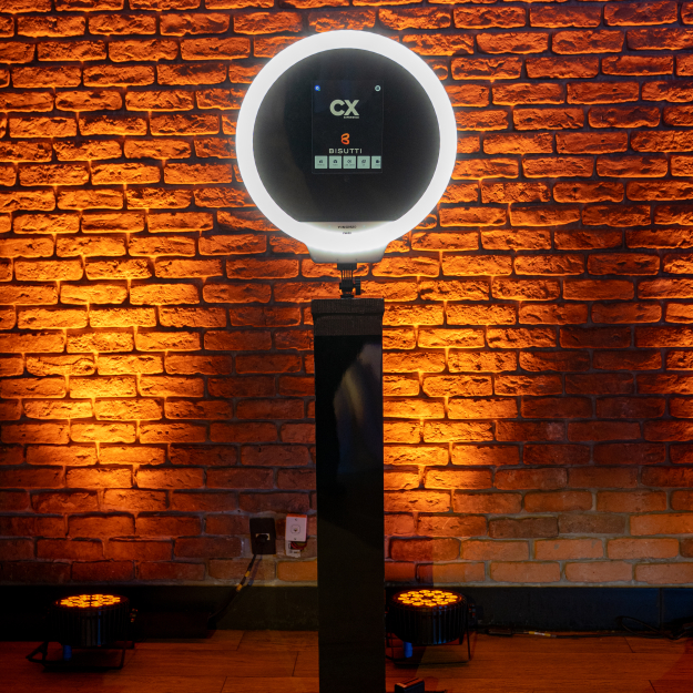 Ring light com tablet para fazer vídeos, receba os vídeos pelo QR code ou airdrop. Pode ser fixo ou móvel no evento.