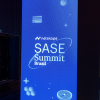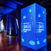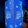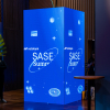 Totem feito com 4 paredes de LED formando um prisma retangular vertical de 3m de altura X 1m de largura.