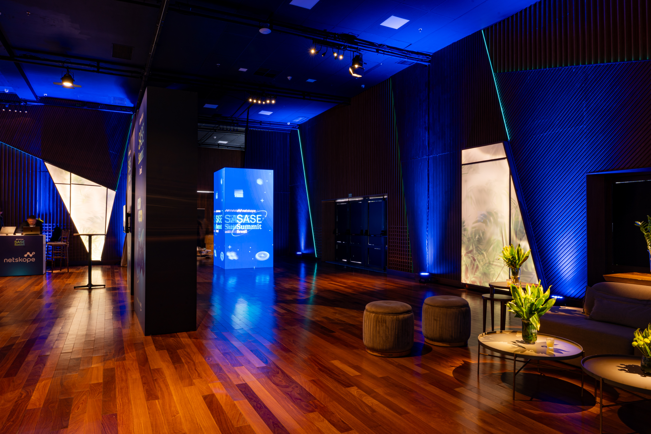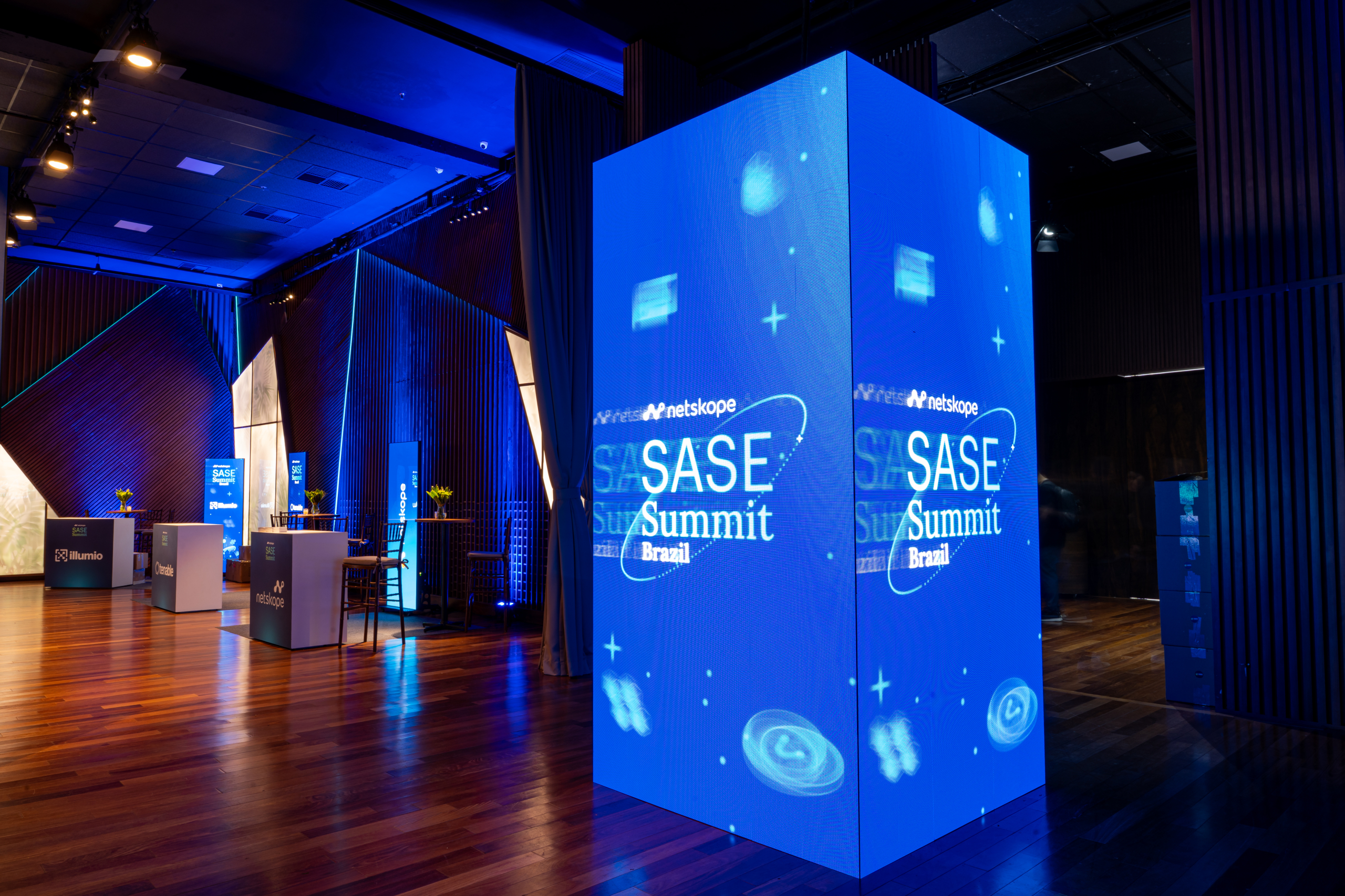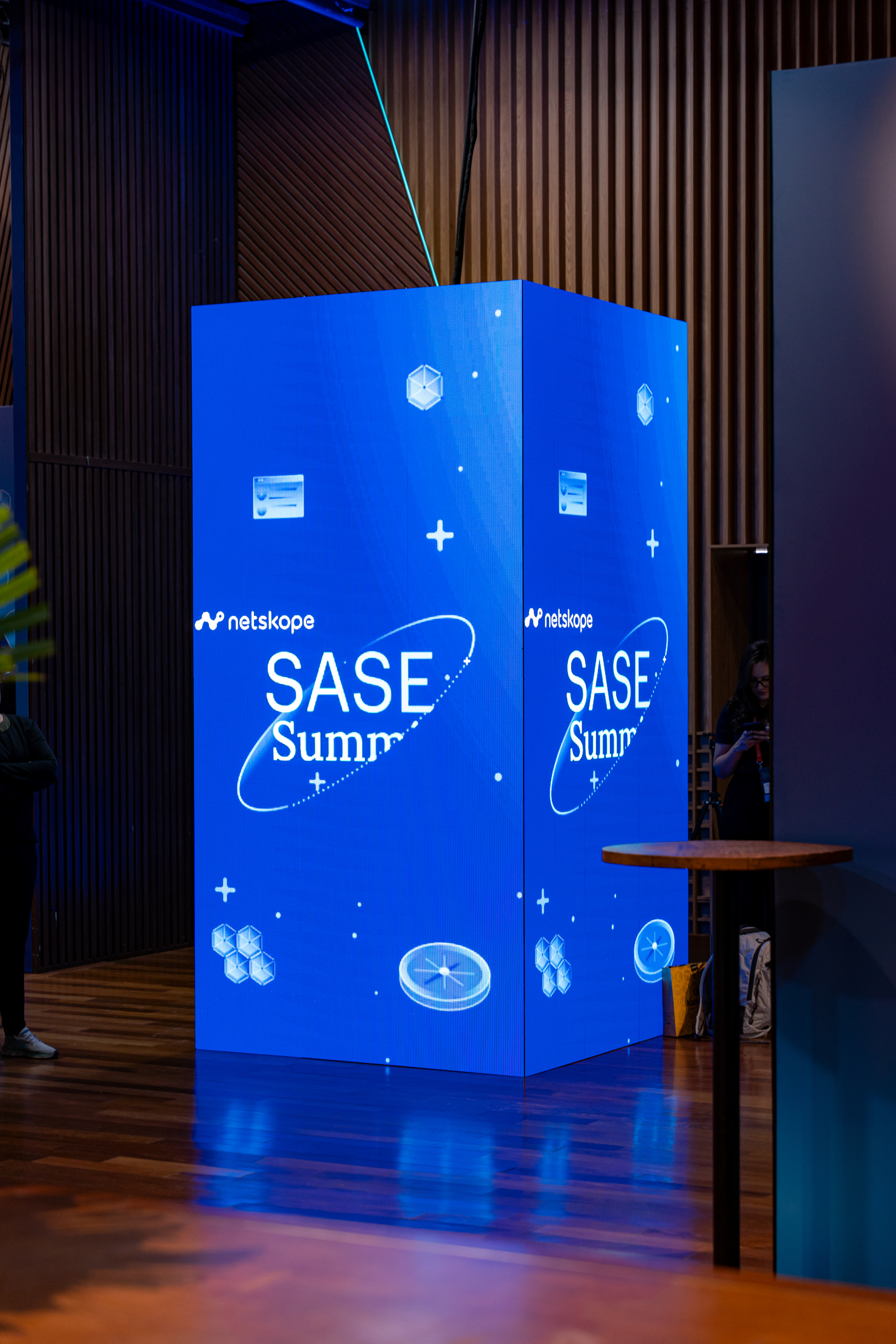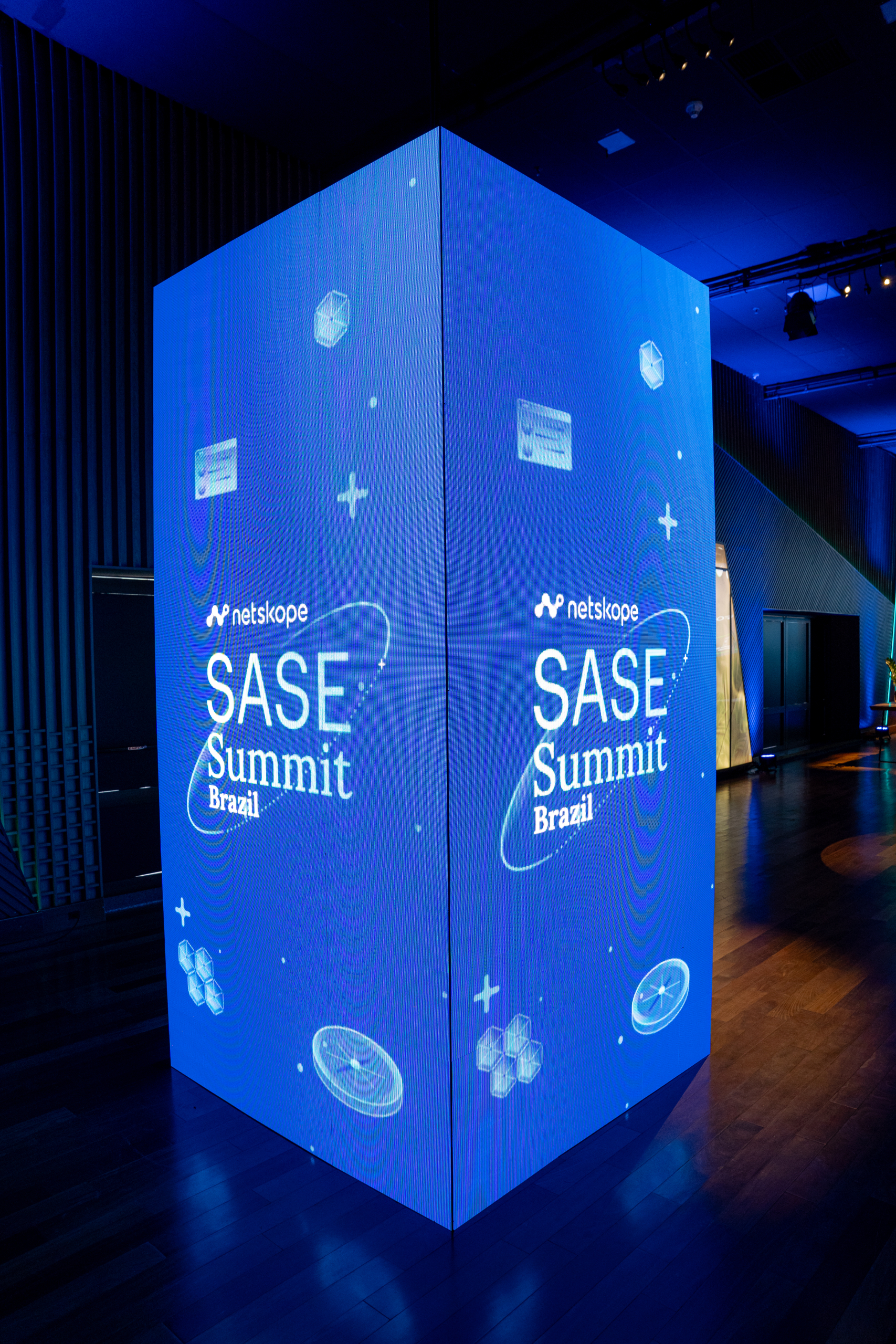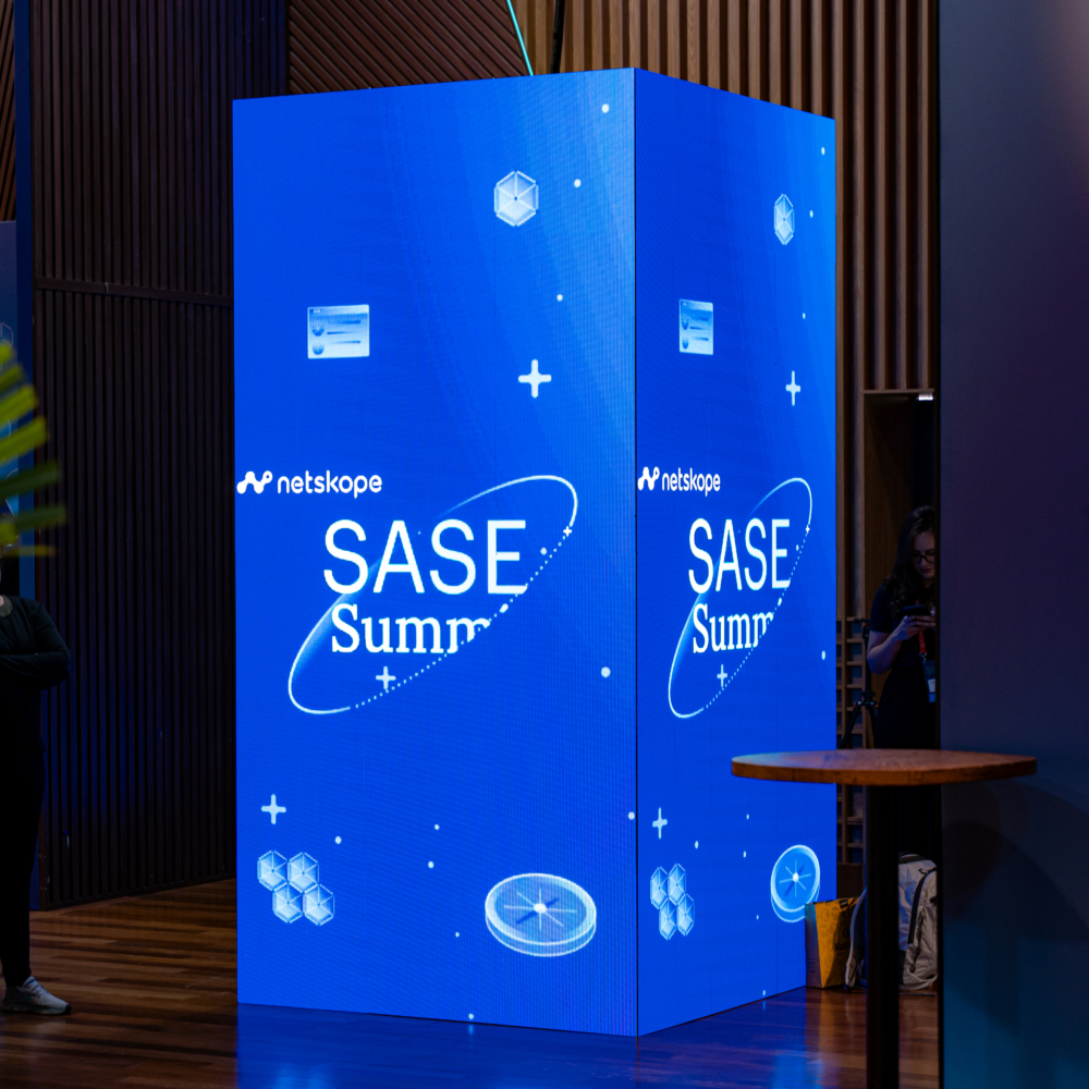 Totem feito com 4 paredes de LED formando um prisma retangular vertical de 3m de altura X 1m de largura.