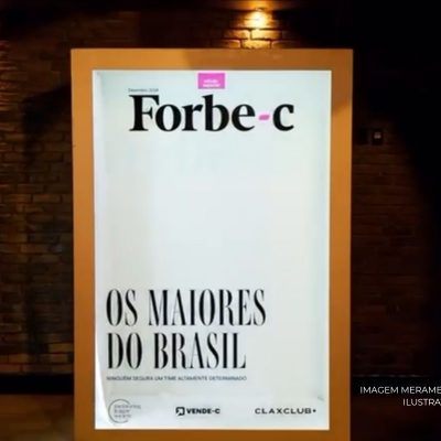 Cenografia construída em caixa gigante com capa da Forbes transparente para que o anfitrião da festa entre dentro da capa da revista e faça...