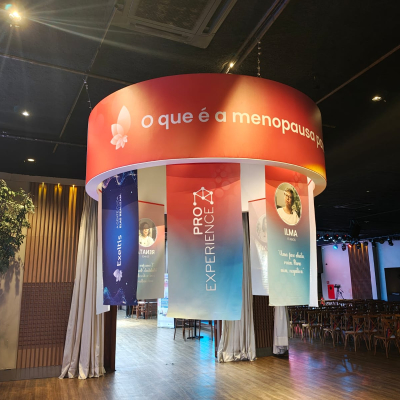 Backdrop cenografado com pódio integrado, construído com estrutura interna de madeira cenográfica e acabamento de alto padrão. Impressão com identidade visual personalizada do evento,...